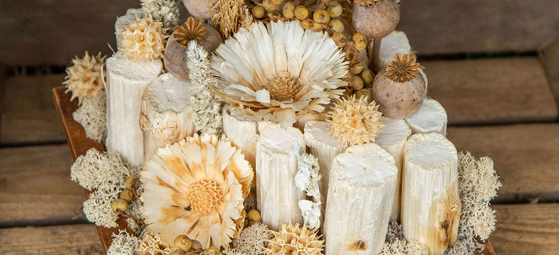 Vores tilbud spænder fra naturlige kviste og grene som korkeg til materialer dyppet i farve som tonkin, rotting og achillea.