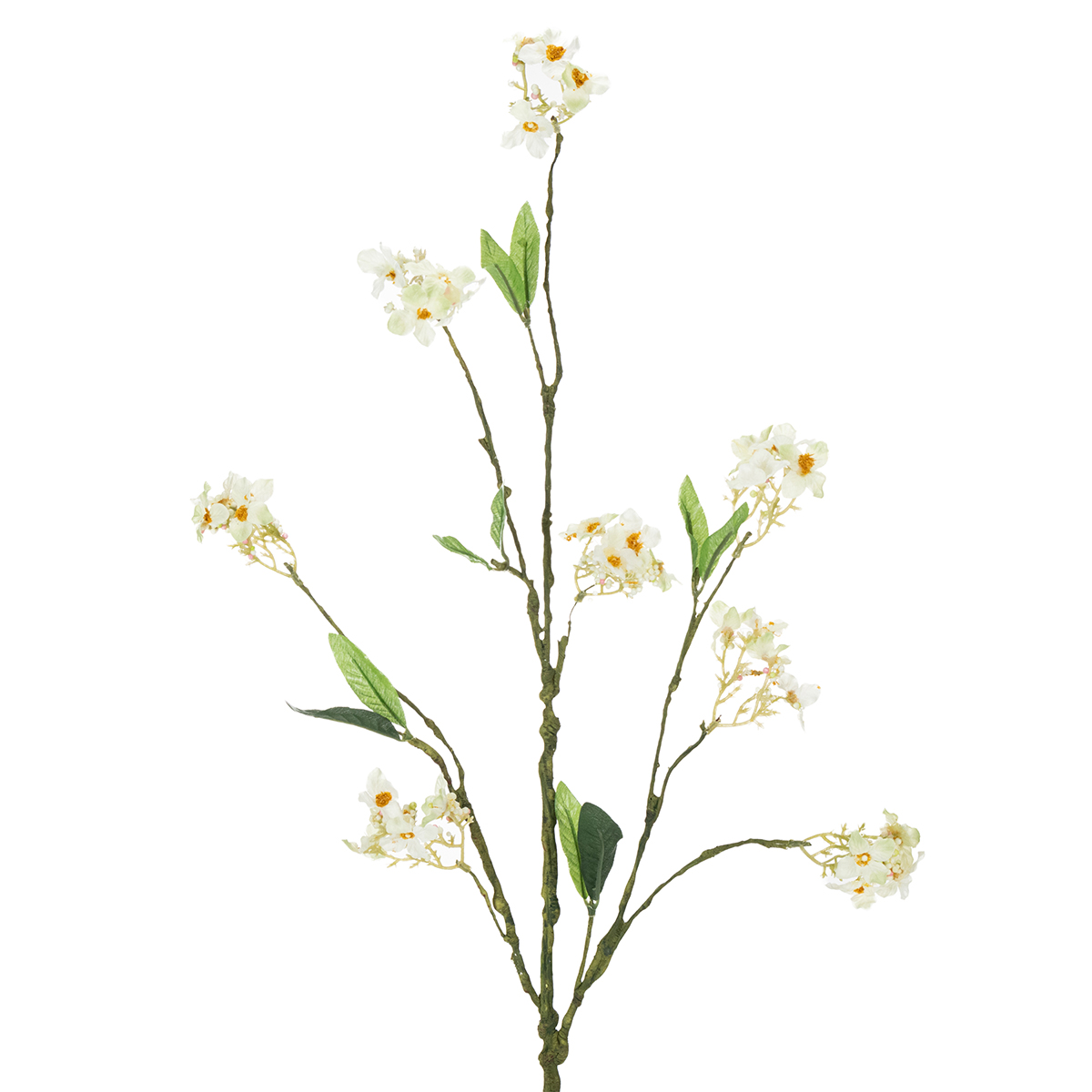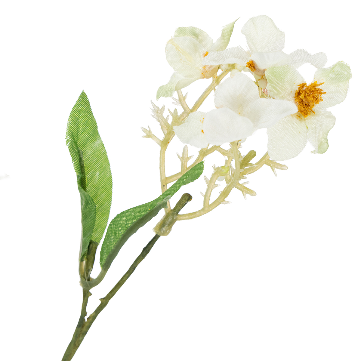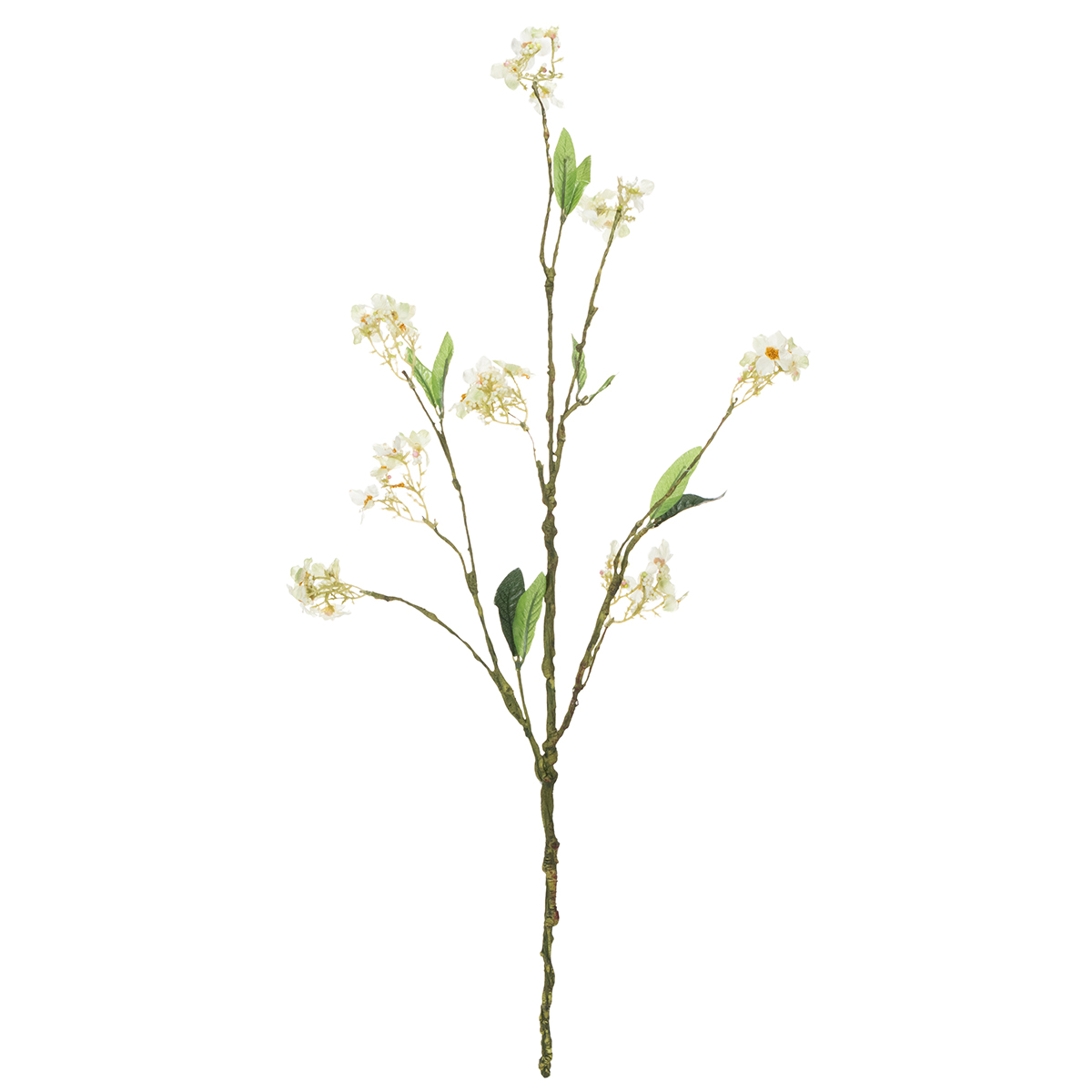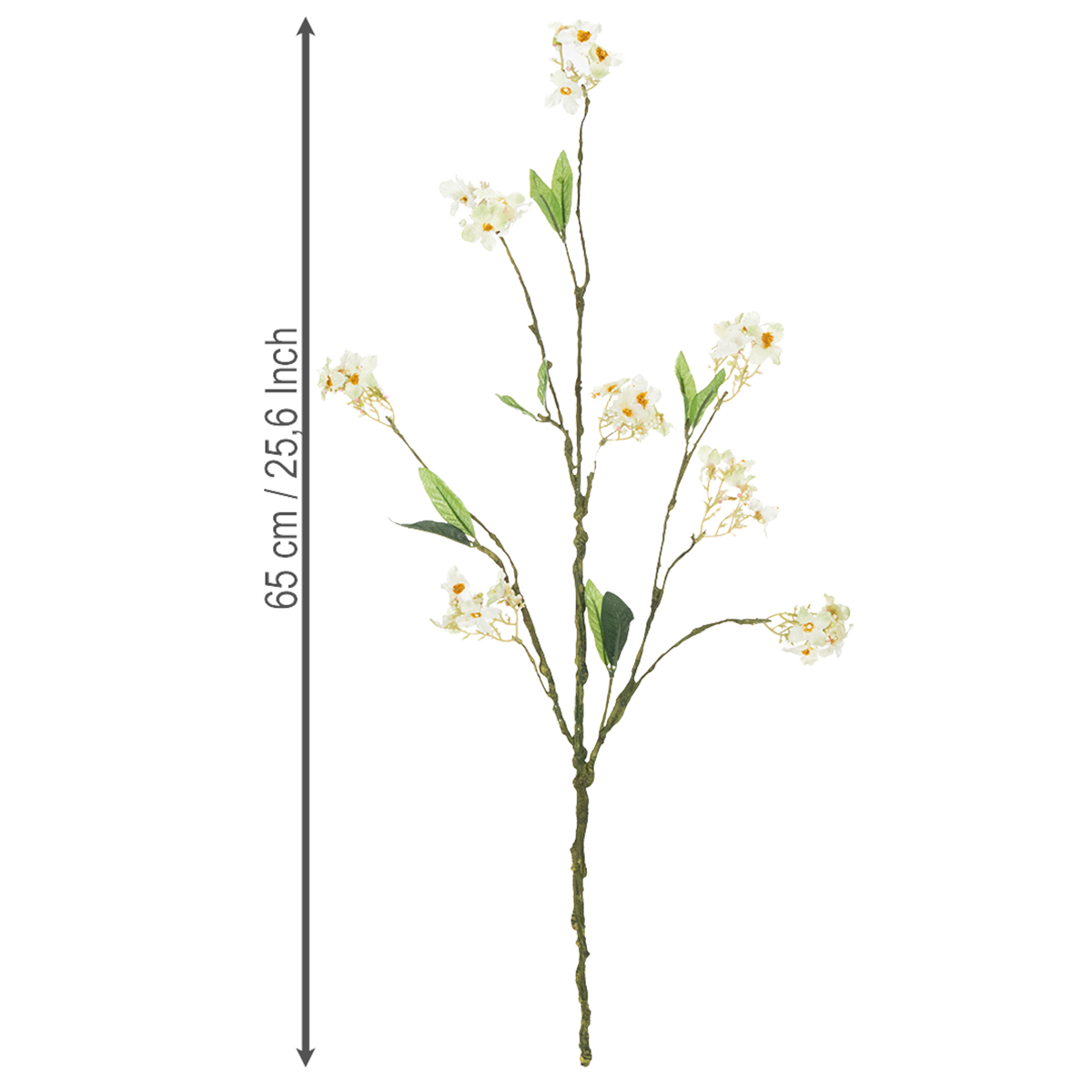 Blomstringsgrenen er cirka 65 centimeter lang og forgrener sig fra sin grønne hovedstængel i forskellige store og små grene. Stænglen og de små grene er lavet af plastik og har et let forstenet udseende, da de indeholder mange små buler og tråde, ligesom deres naturlige modstykker. De små, hvide, åbne blomster har stadig gule pollenklaser i midten og små perler, der repræsenterer lukkede blomster, hvilket næsten får dig til at se frem til en smuk og rigelig æblehøst.
