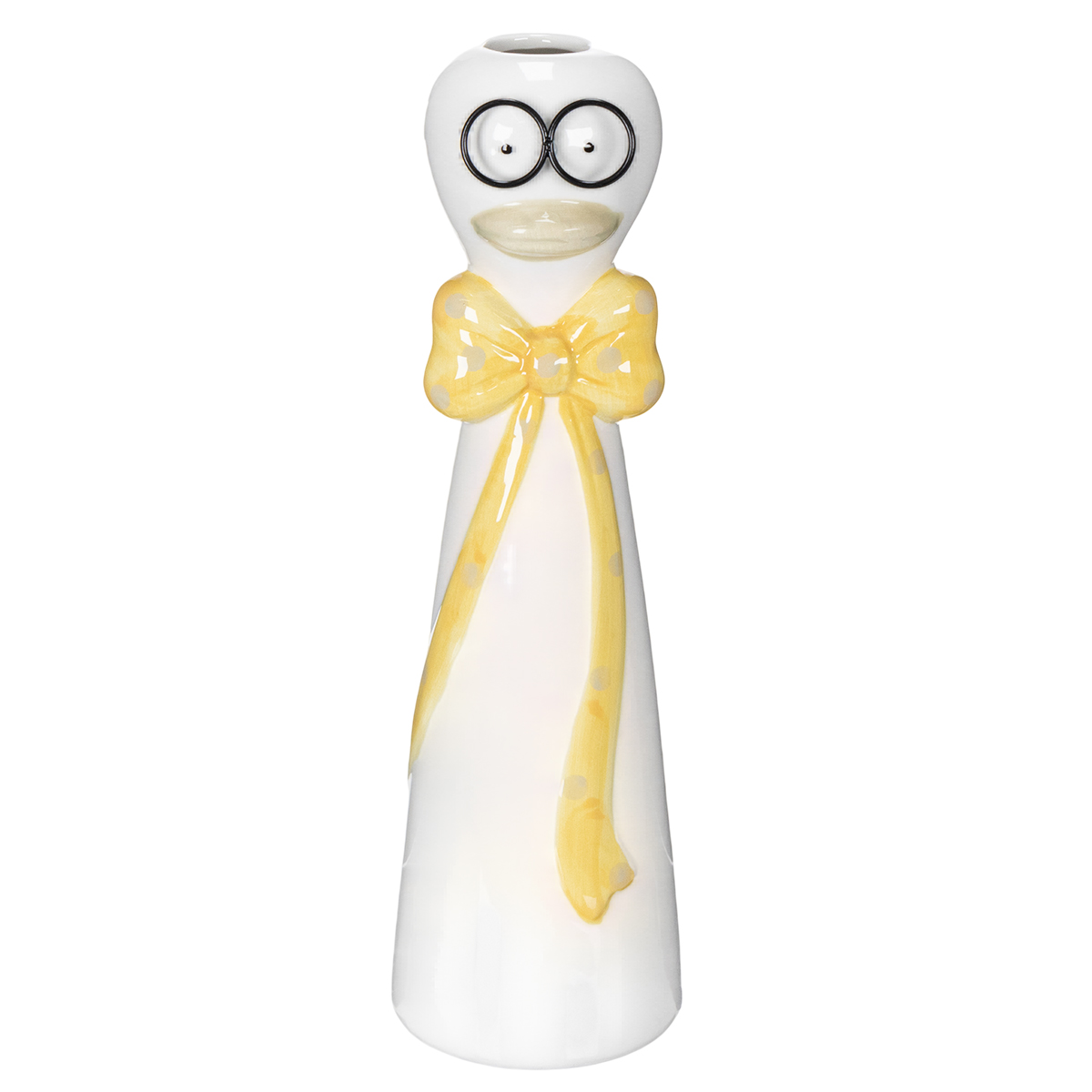 Leder du efter en unik vase, der både er praktisk og helt sikkert vil bringe et smil frem? Vores bedårende andevase er lige, hvad du har brug for! Med en højde på 24 cm og charmerende detaljer som det gule bånd, vil den helt sikkert være et dejligt midtpunkt. Uanset om det er på spisebordet, i vindueskarmen eller som en unik gaveidé, vil dette sæt af to keramiske vaser i hvid og gul tilføje et muntert præg til din indretning.