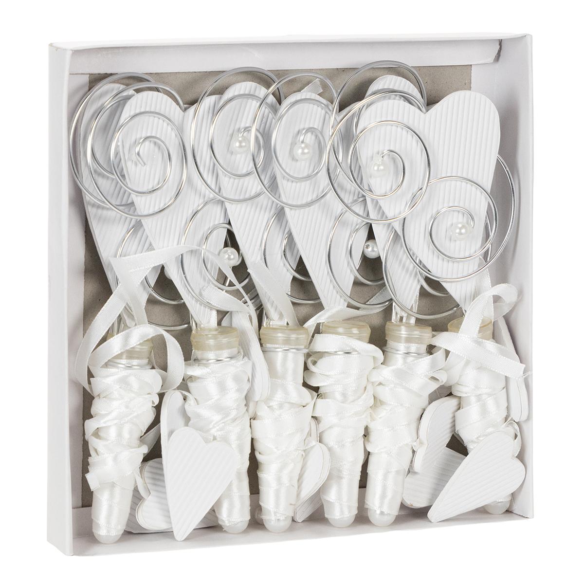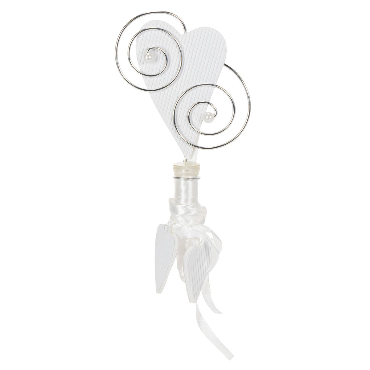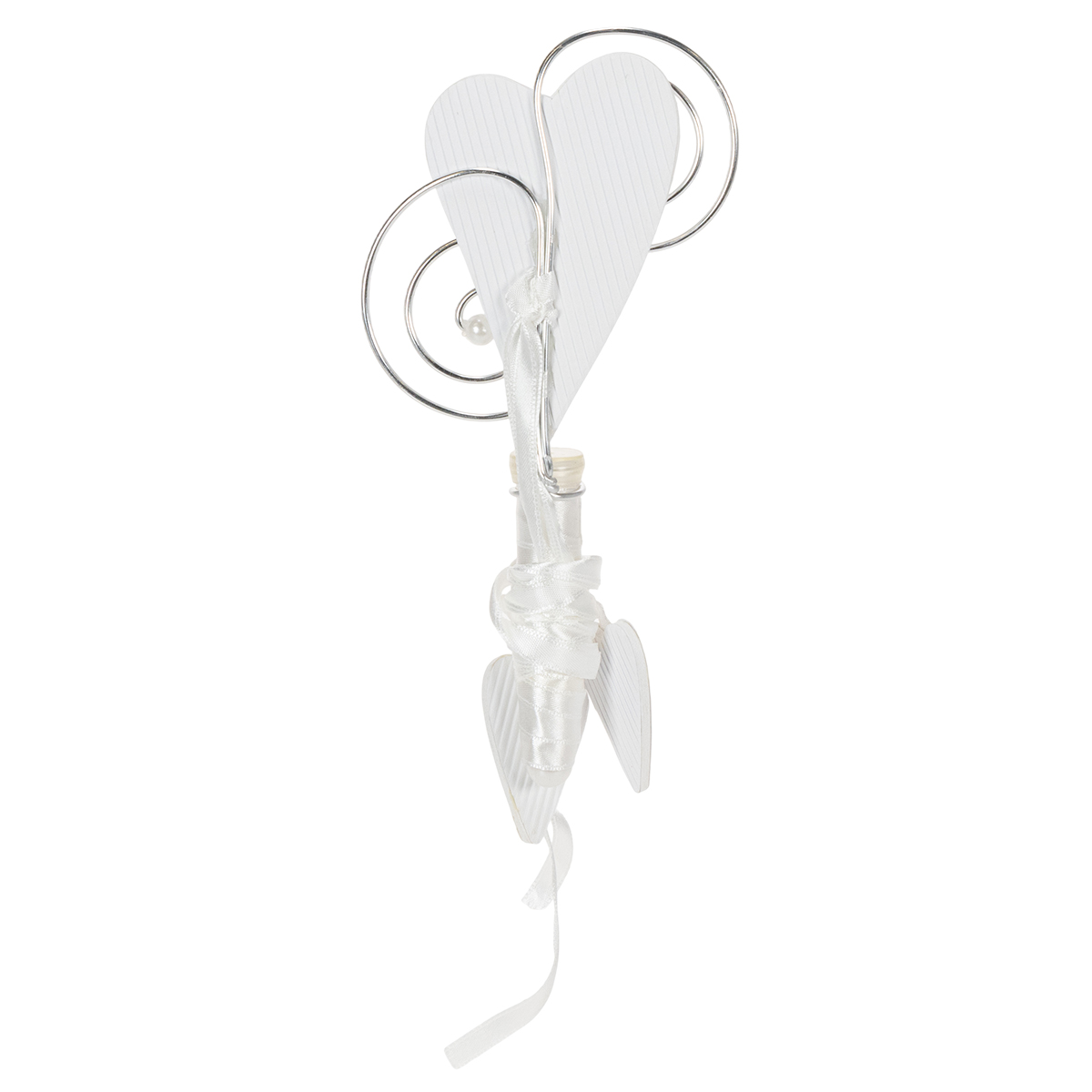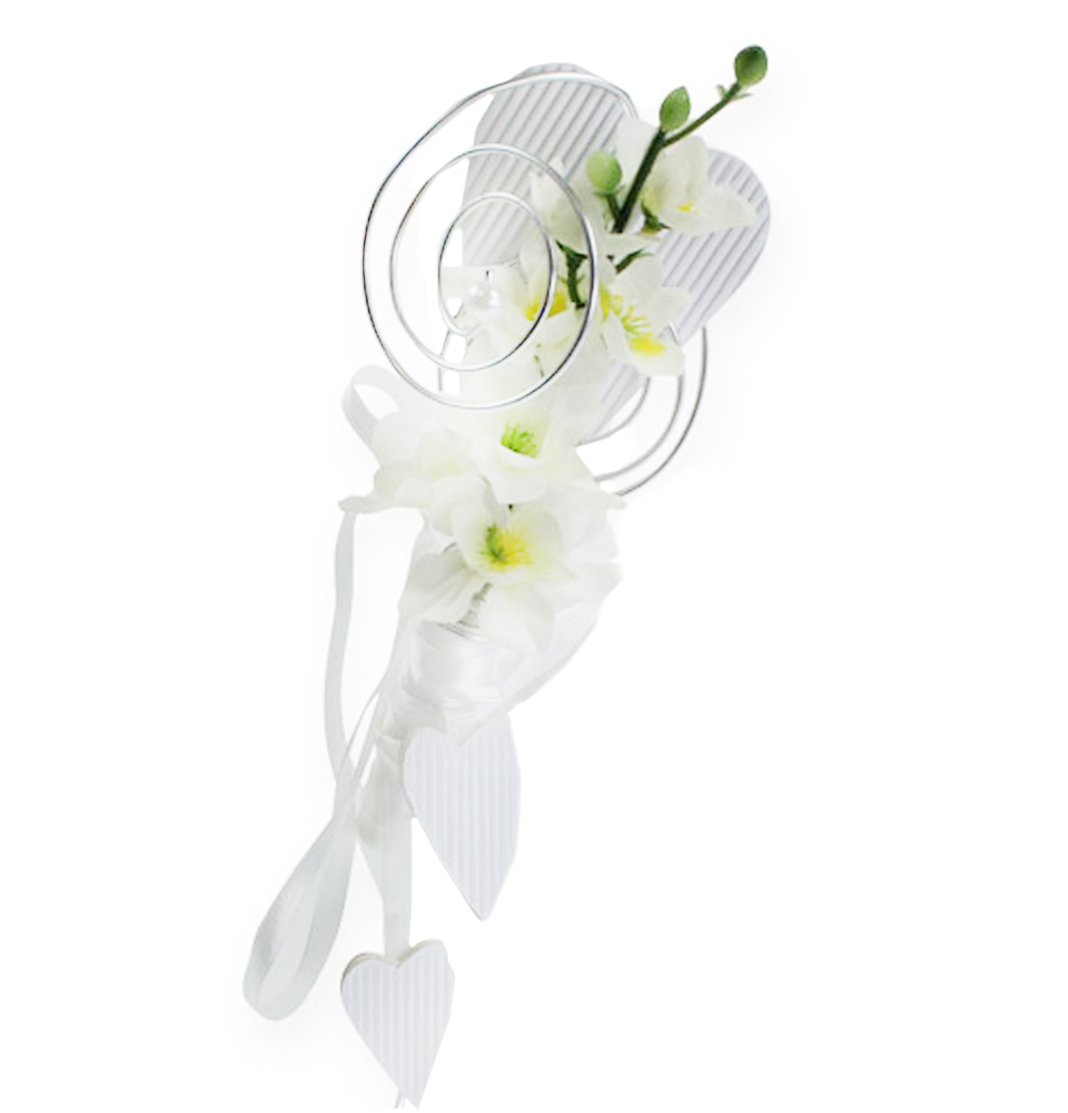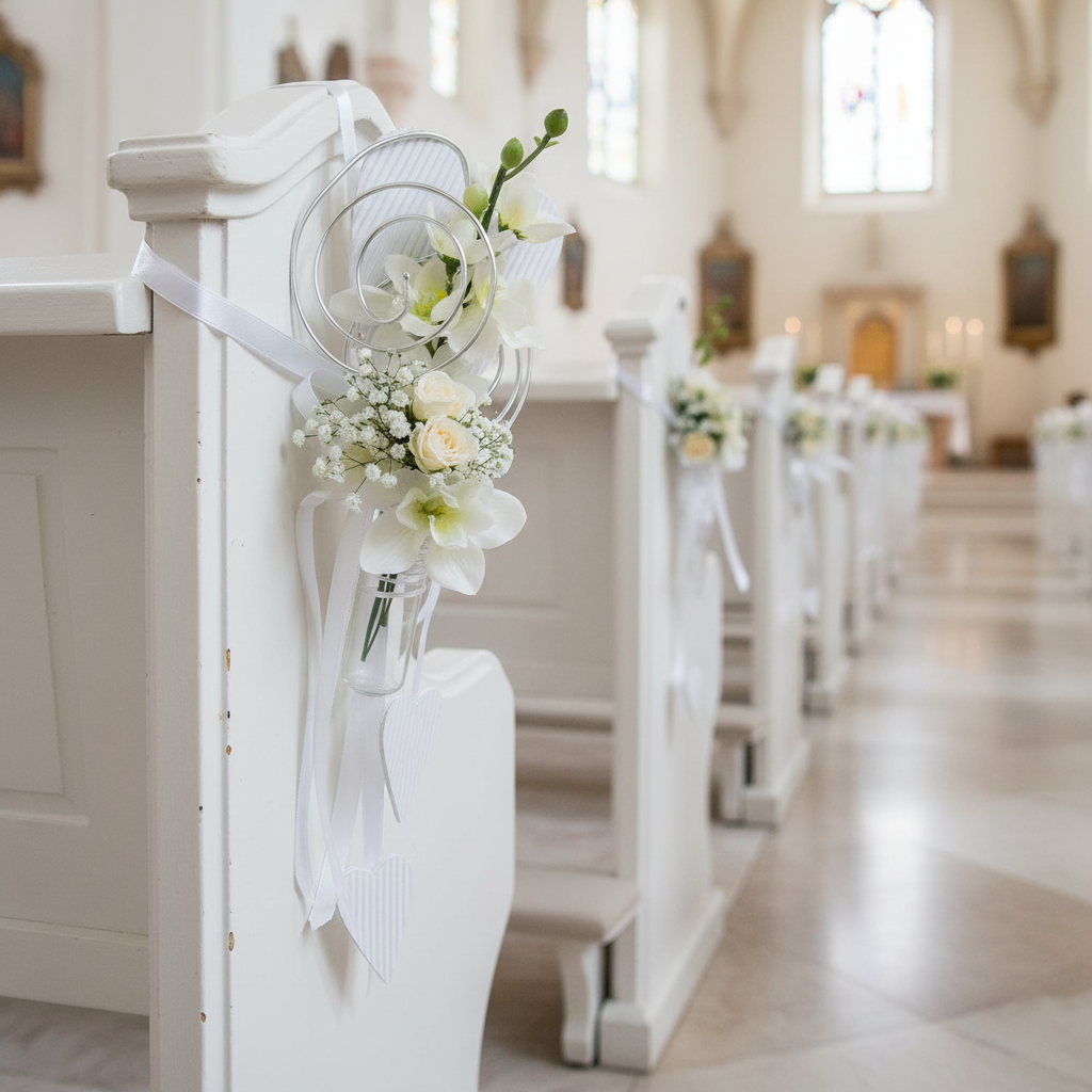Denne bænkophæng med rør og hjerte bør ikke mangle i nogen bryllupsdekoration! Hæng hjertet på ydersiden af kirkestængerne med en krog, og lad det hvide silkebånd, hvortil to hjerter er bundet med bølgepapir, falde ned på gulvet. Som om det ikke var nok, har bøjlen en rund holderenhed, i hvilken det medfølgende rør passer som en handske.
