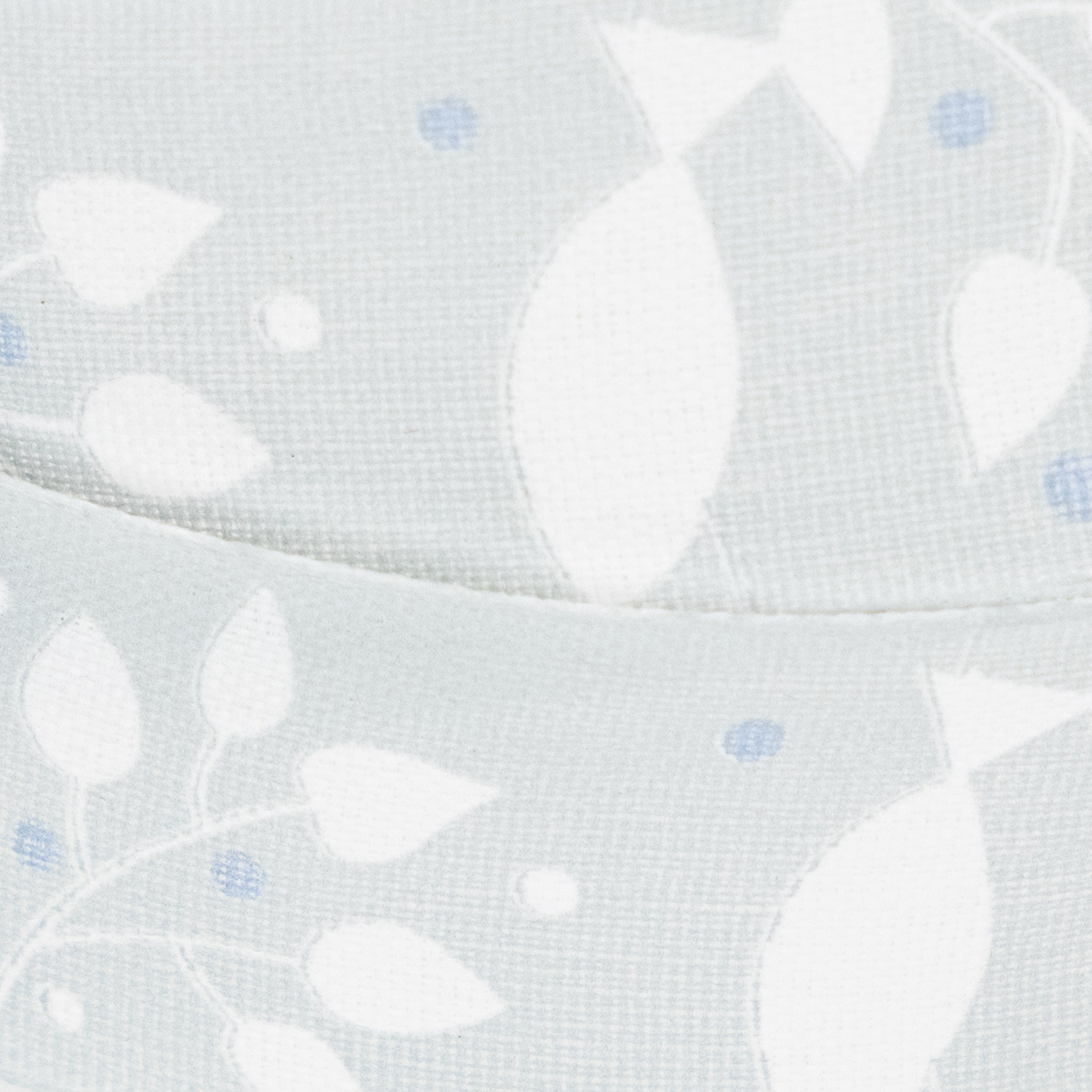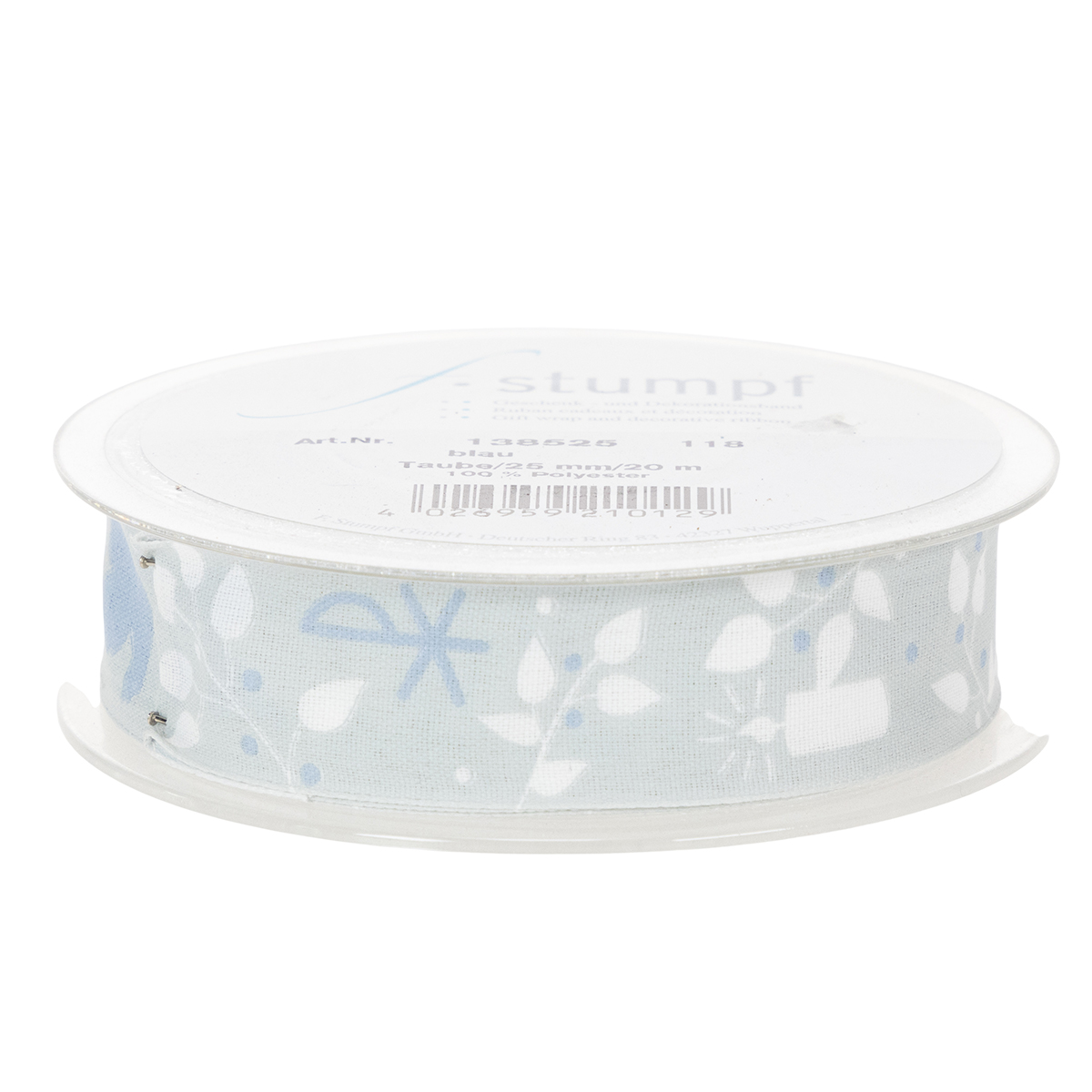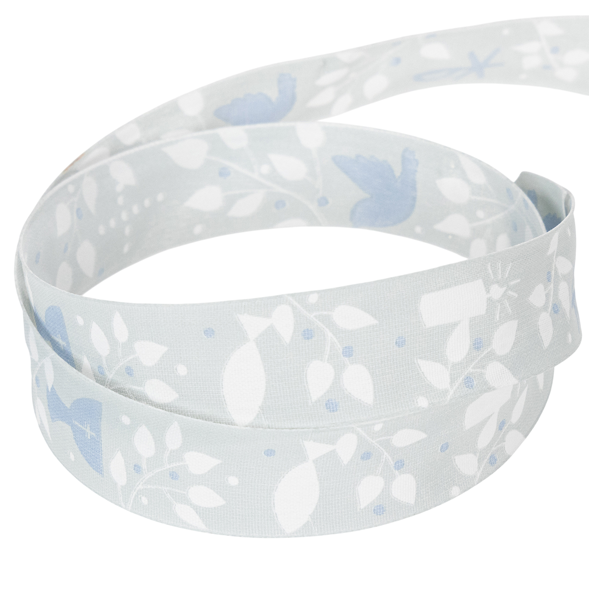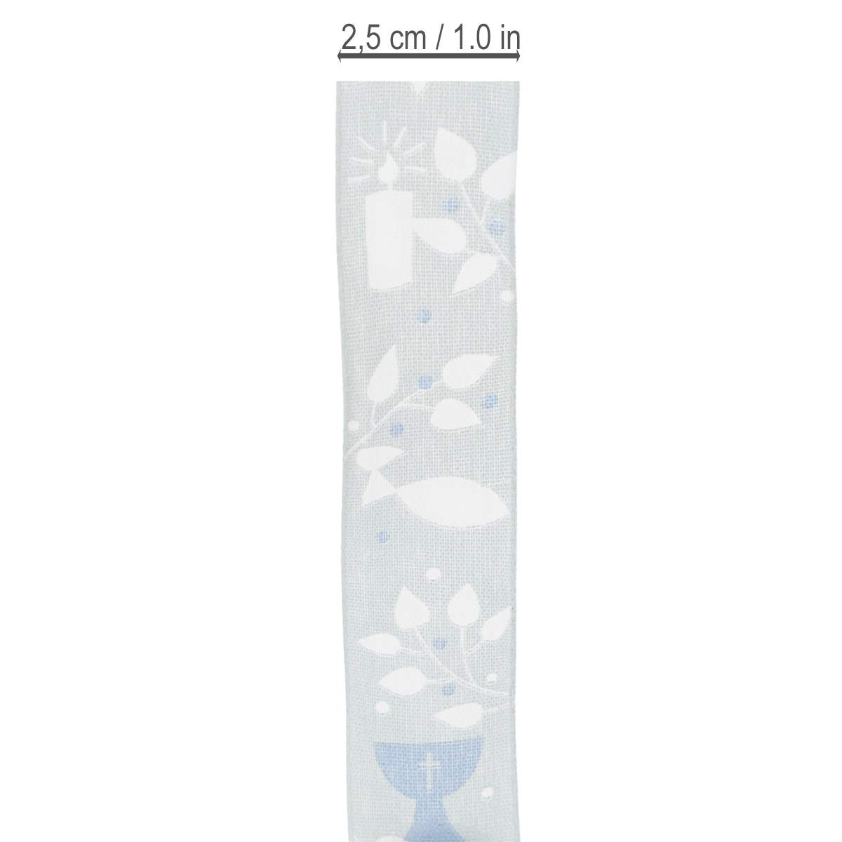Det lyseblå stofbånd er printet med kristne symboler i hvid og mørkeblå, som refererer til den religiøse lejlighed og har et vidunderligt tidløst design. Da motiverne er omgivet af ranker af blade, kan båndet nemt indarbejdes i blomsterdekorationer til nadver. En selvkant giver det dekorative bånd stabilitet.