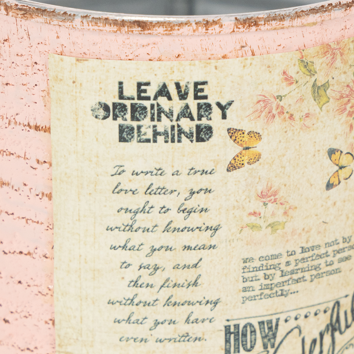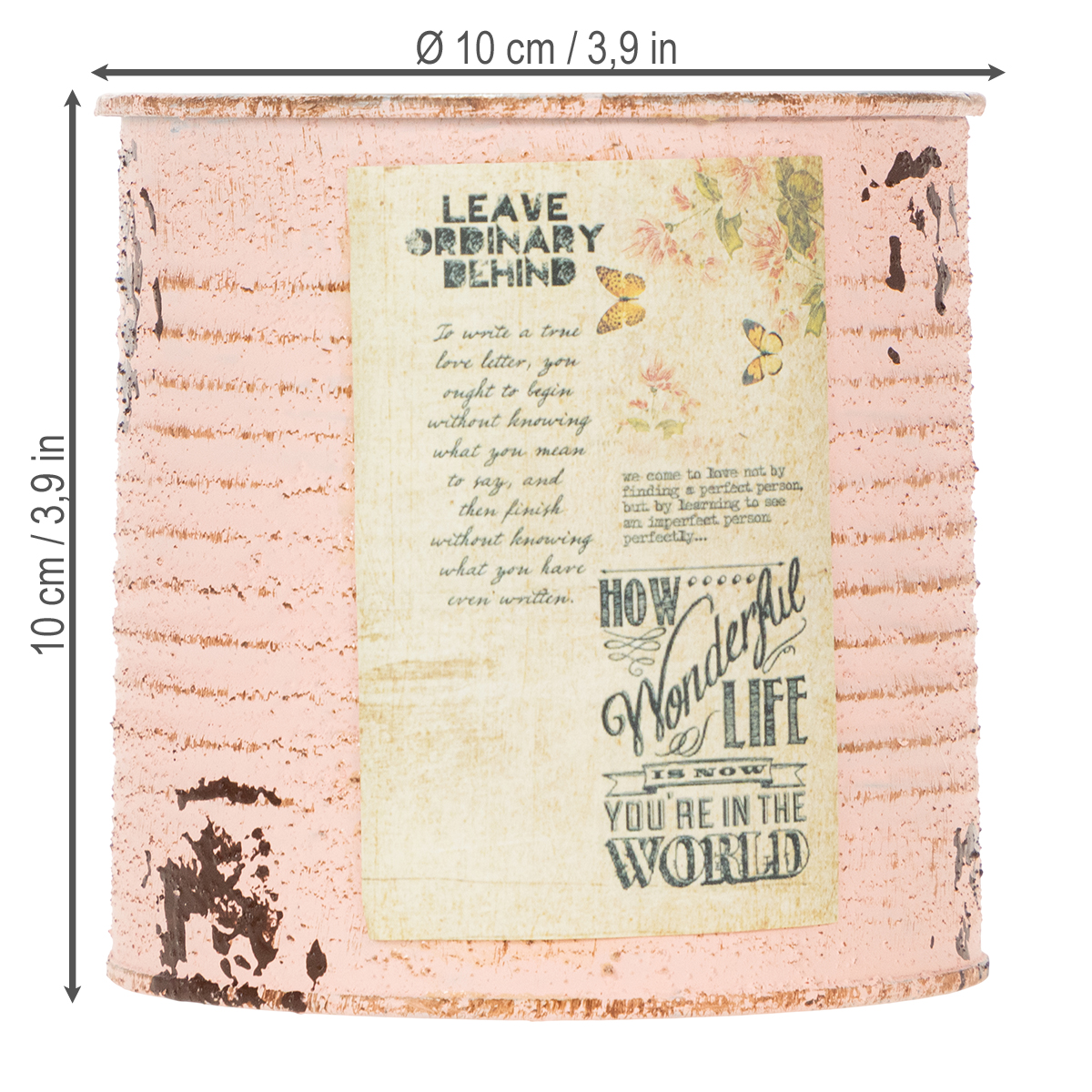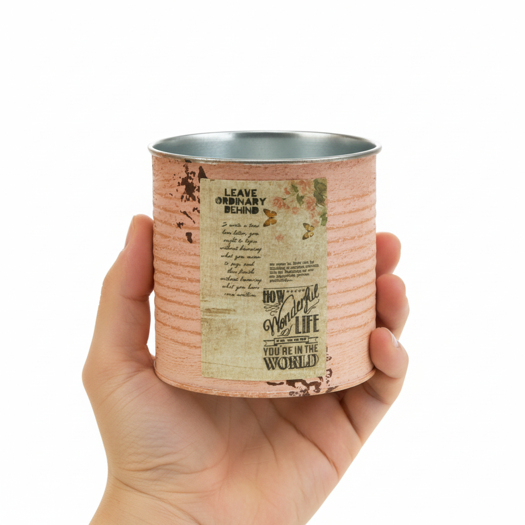 Urtepotten lavet af en dekorativ dåse i pastelfarven laks er mindst lige så stemningsfuld som en rigtig vintage dåse. Sommerdekorationen i metal har dog den afgørende fordel, at der ikke er skarpe kanter her. På den måde kan du plante dåsen uden risiko for skader. En rusten brun nuance dukker op under den børstede pastelfarve på dåsens riller. Derudover understreger malede rustpletter og en nostalgisk etiket retrodåsens shabby chic. Den dekorative krukkes indre er holdt meget enkelt i sølv.