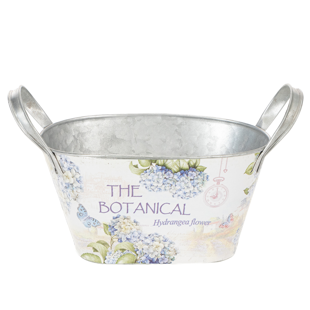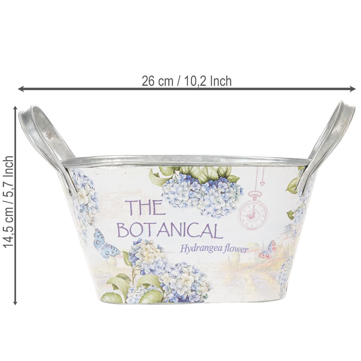 Den ovale blomsterskål med hanke er en charmerende måde at pifte din sommer op med stilfulde metaldekorationer! Printet med blå hortensiaer formidler følelsen af varme dage i haven.