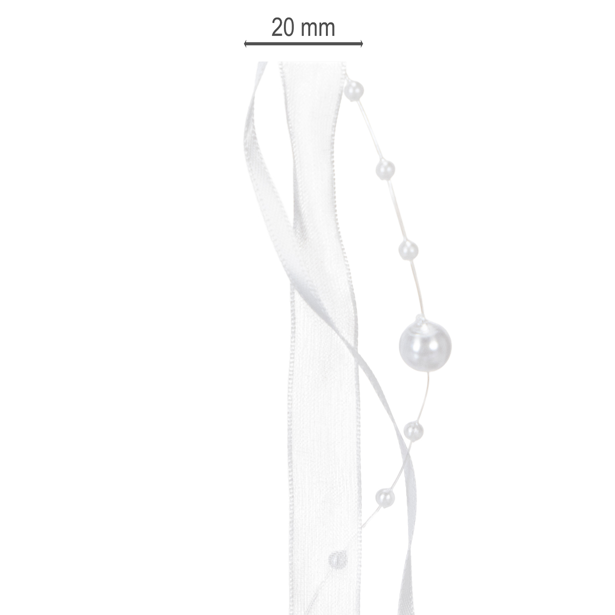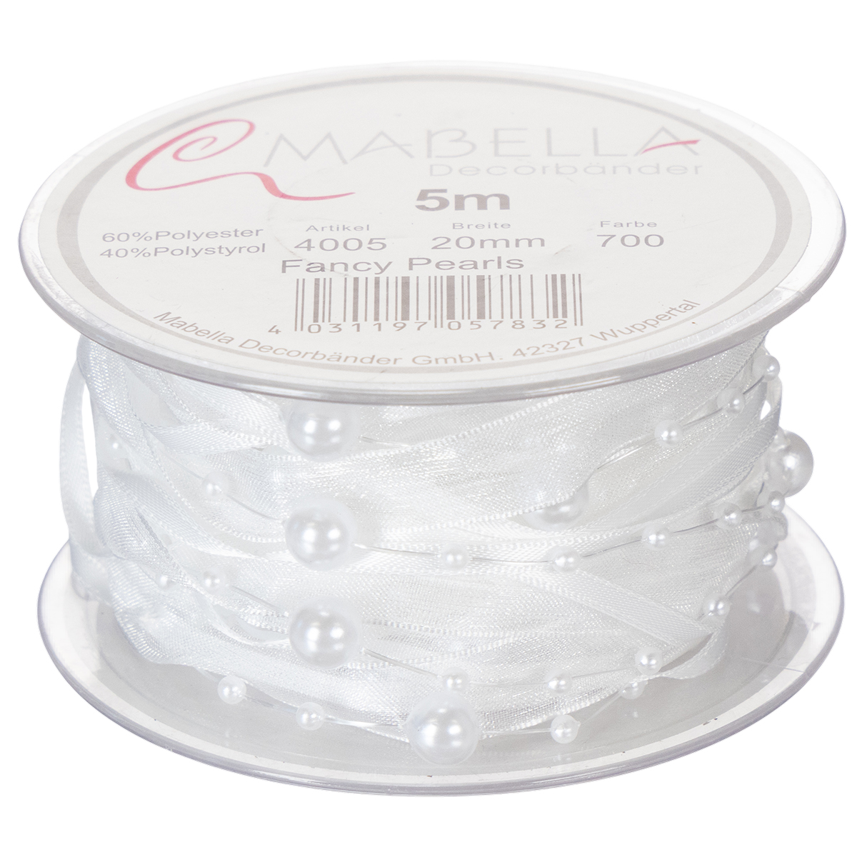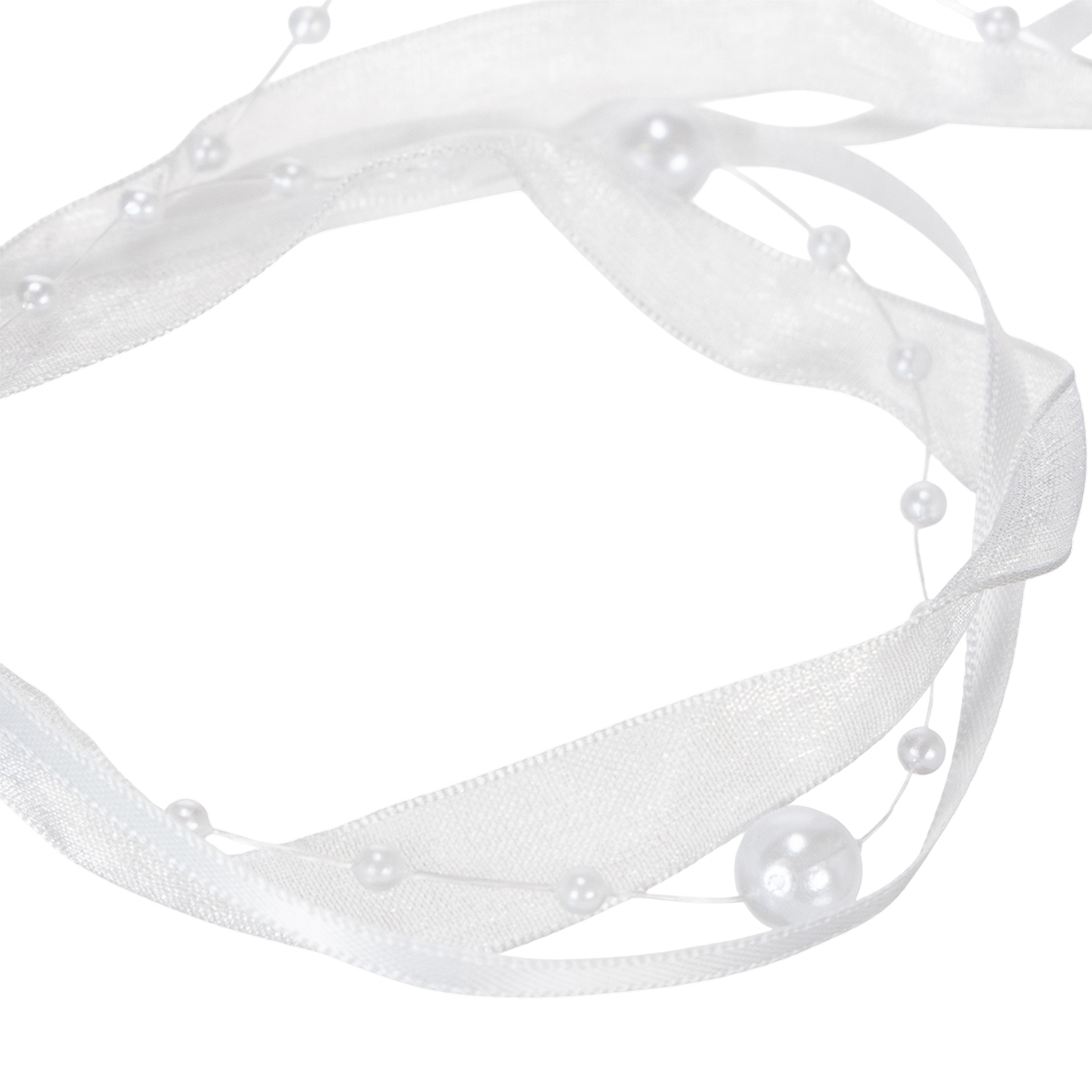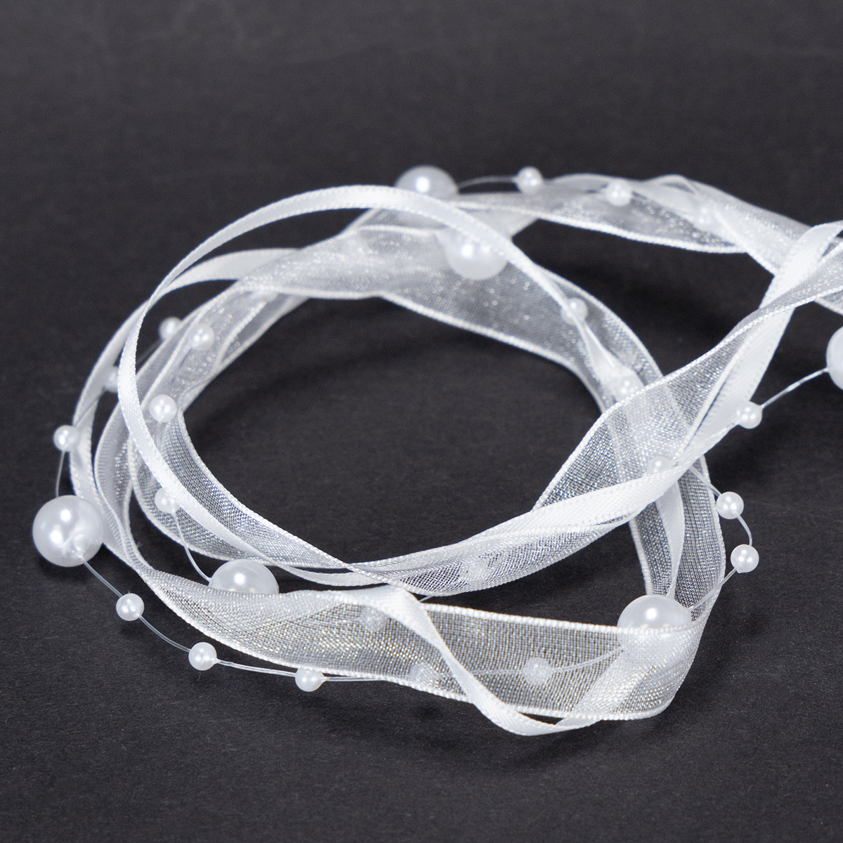 Bryllupsbandet i hvidt har en længde på cirka 5 meter og er viklet på en rulle plast. Bredden er ca. 20 mm, og perlerne har en diameter på ca. 0,2 til ca. 0,8 centimeter.