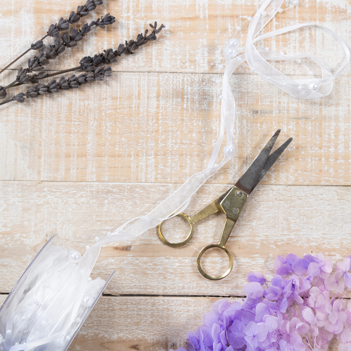 Men du kan også bruge det til et bryllupsarrangement og derefter lægge det på tværs af blomsterarrangementet. Generelt kan du bruge det dekorative bånd som et slags tilbagevendende tema i hele bryllupsdekorationen og således f.eks. Binde borddæksler sammen, vikle rundt om blomsterpotterne på planterne eller også dekorere vægdekorationen med dem. Derudover kan du også integrere det smukke perlebånd i blomsterpigens kjoler og også dekorere bryllupsbuketten med det!
