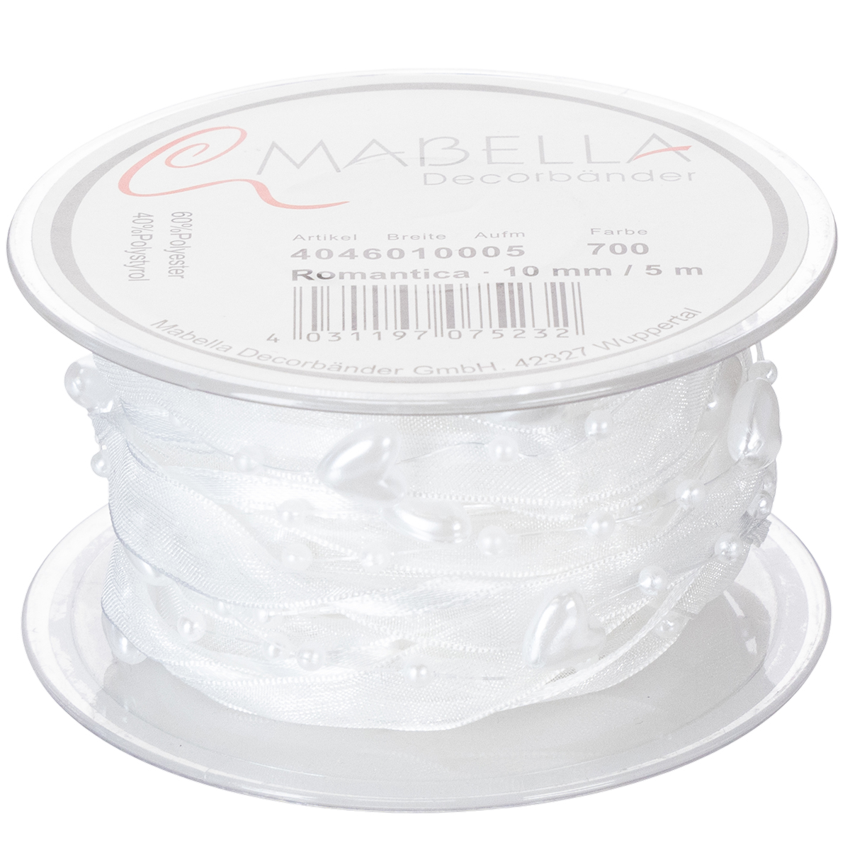 Produktnavn: Bryllupsdekoration organzabånd hvidt 10mm x 5m med hjerter og perler
