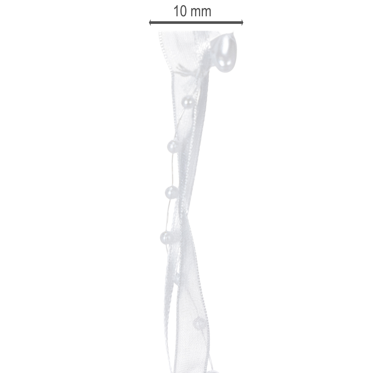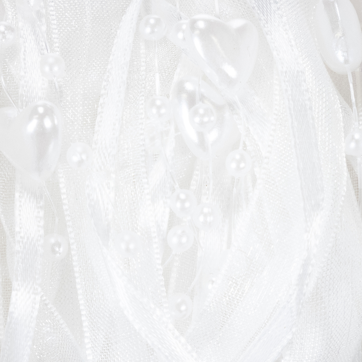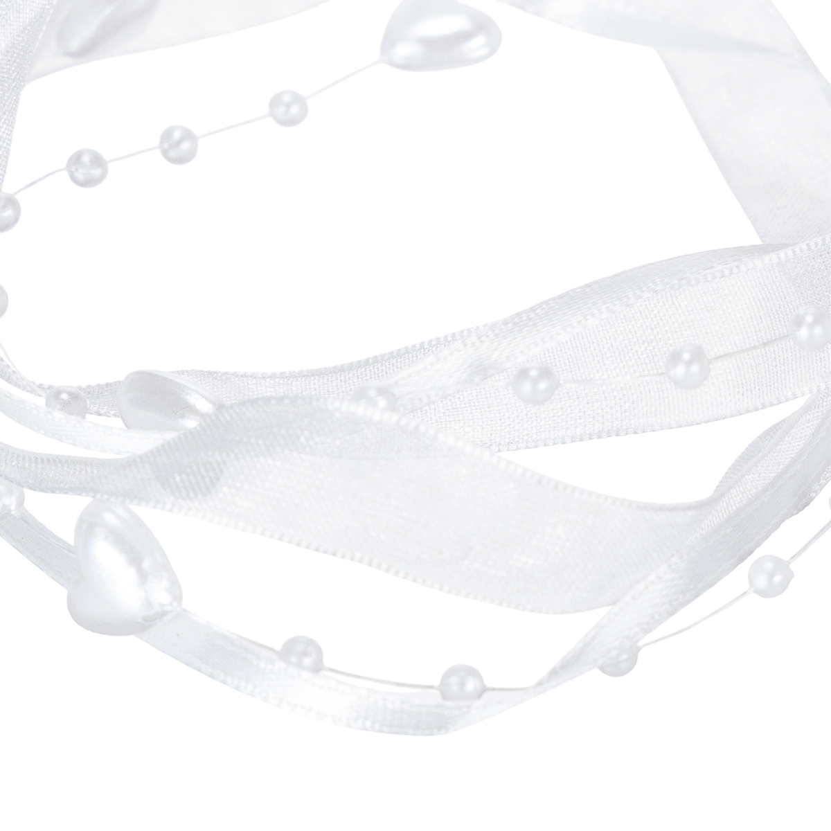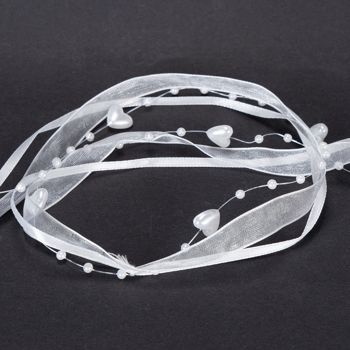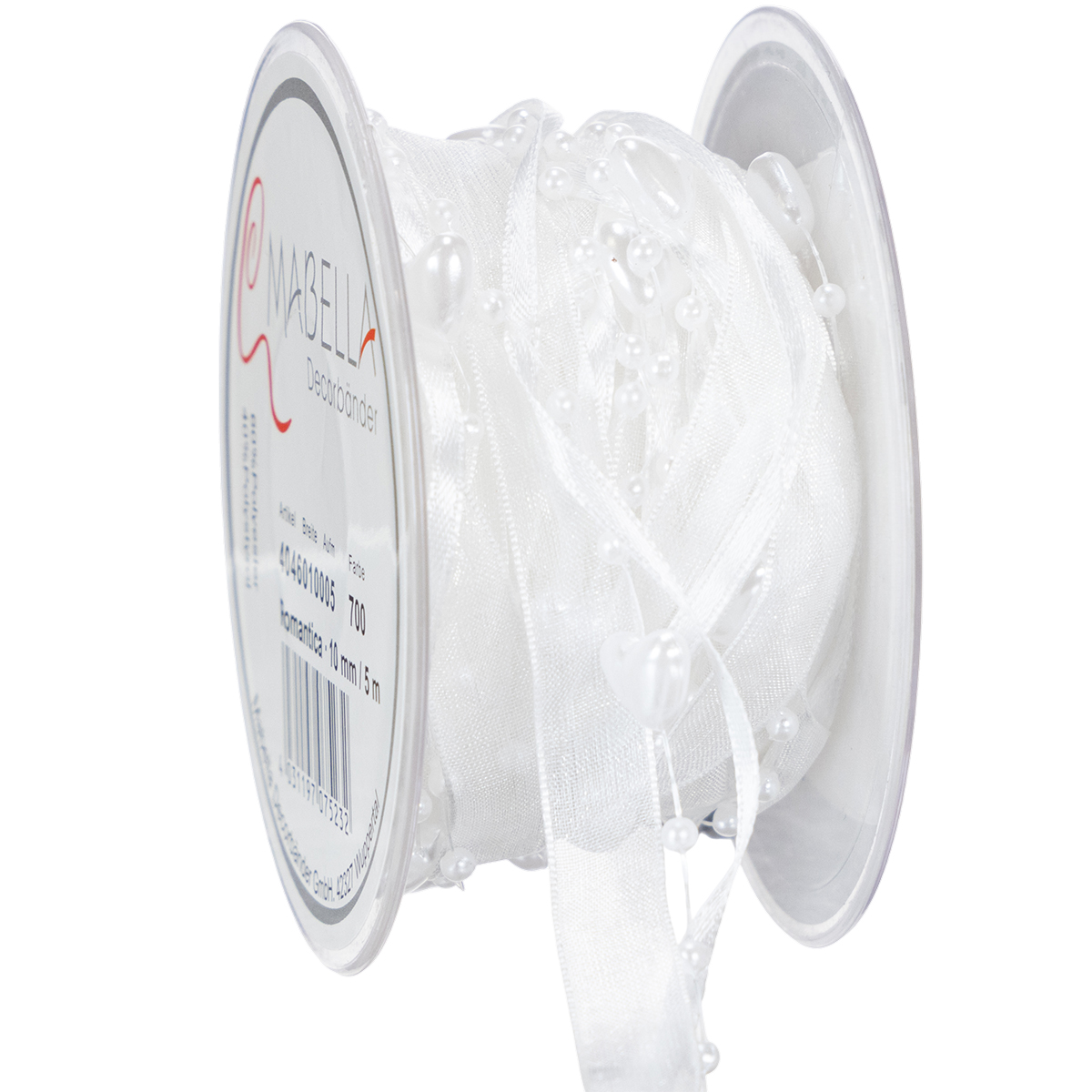 Bryllupsdekoration organzabånd hvidt 10mm x 5m med hjerter og perler