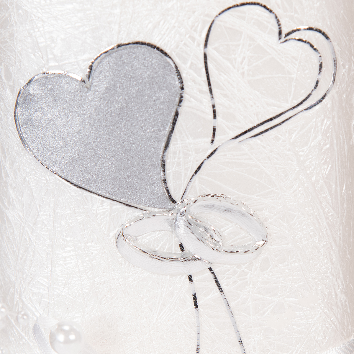 To hjerter på stilke holdes sammen som en blomsterbuket af to sammenflettede ringe. Bryllupslyset er også dekoreret med et hvidt bånd og perler, hvilket ser smukt ud i bryllupsdekorationen. Denne dekoration skal dog fjernes, før lyset tændes.