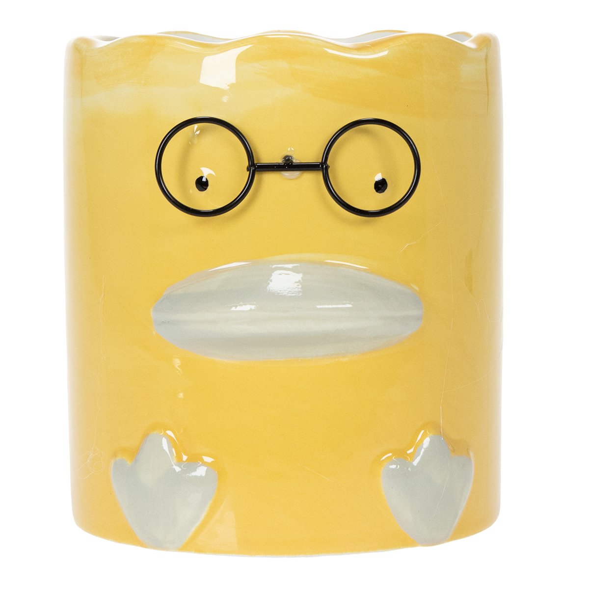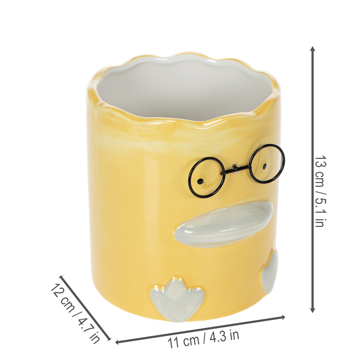 Denne gule keramikvase med et dyremotiv kombinerer funktionalitet og æstetik på en helt særlig måde. Med en højde på 13 cm og en diameter på 12 cm tilbyder den rigelig plads til blomster, tørrede blomster eller endda kuglepenne og kontorartikler. Keramikken af høj kvalitet sikrer stabilitet og holdbarhed, mens det charmerende andedesign med sine delikate detaljer som den bølgede åbning og de finurlige glas tilføjer et moderne og humoristisk præg. Denne vase er ideel til at fremvise lyse tørrede blomster eller friske afskårne blomster. For et mere naturligt look kan den også plantes med små stueplanter såsom sukkulenter. Den er også perfekt til opbevaring af kuglepenne eller andre småting, hvilket gør den til en praktisk tilføjelse til et kontor eller et børneværelse. Dette dekorative stykke er ikke kun en smuk tilføjelse til dit eget hjem, men også en vidunderlig gaveidé til venner eller til en indflytterfest. En perfekt blanding af praktisk brug og dekorativ skønhed!