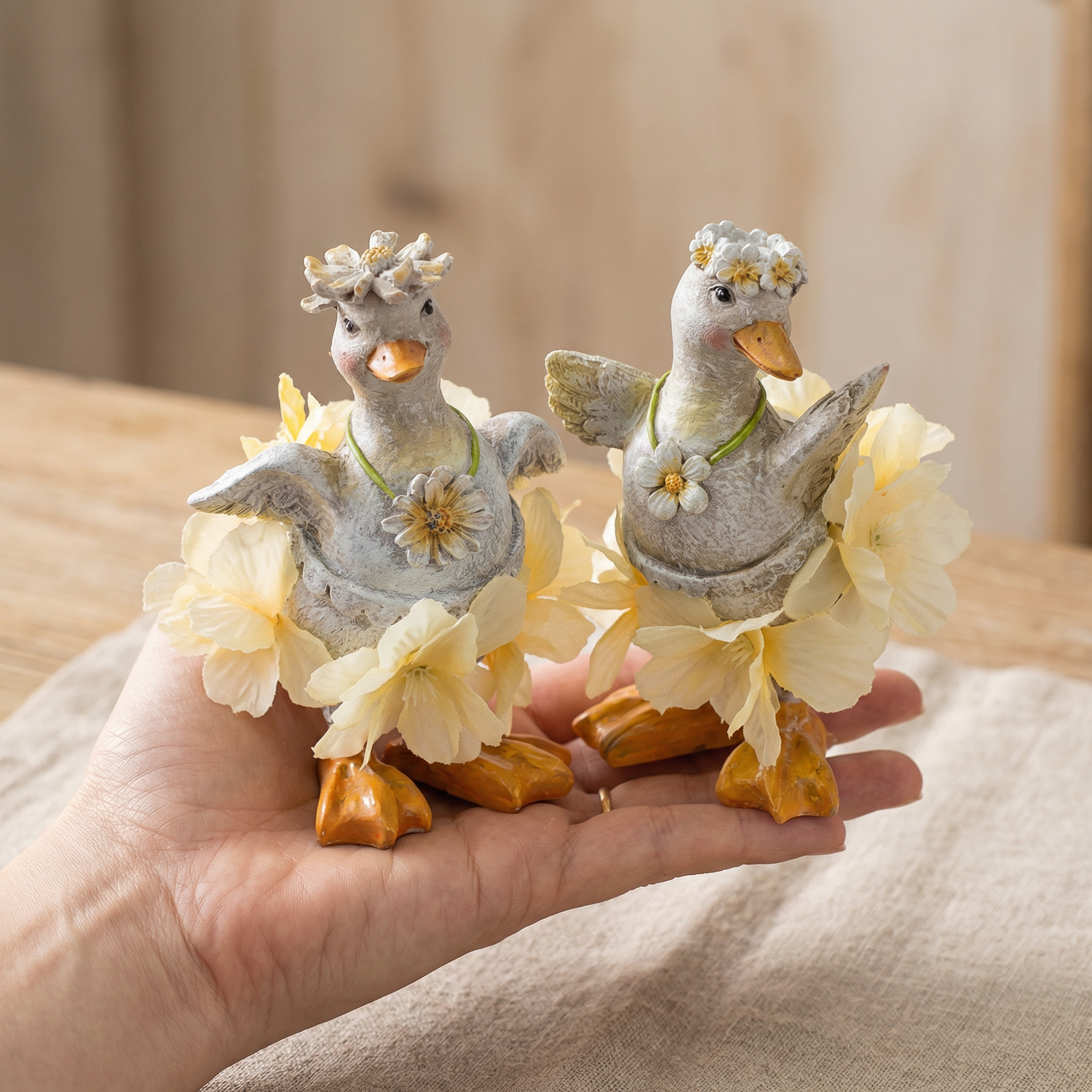 Integreret i et skandinavisk eller moderne miljø, harmonerer disse fine ænder smukt med lette, naturlige materialer som træ og hør. De er perfekte som forårs- eller påskedekorationer til at skabe en munter atmosfære.