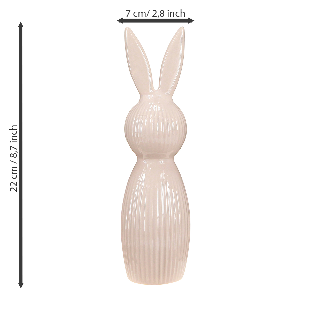 En dekorativ genstand, der kombinerer stil og charme: Denne keramiske kanin er 22 cm høj og imponerer med sin slanke silhuet og sarte lyserøde nuance. De fine, lodrette riller giver den en elegant tekstur og tilføjer et legende bevægelsespræg til designet. Med en diameter på 7 cm er den pladsbesparende og passer perfekt selv på smalle vindueskarme eller hylder. Det keramiske materiale af høj kvalitet imponerer med sin soliditet og holdbarhed – ideel til altid at se bedst muligt ud, selv i områder med meget trafik som stuen eller spisestuen.