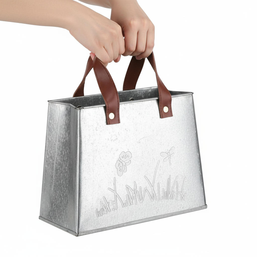 Vores sølvfarvede dekorative metaltasker kombinerer funktionalitet og design på en ekstraordinær måde. Disse plantekasser er ideelle til dekoratører, kreative hjerner og alle, der ønsker at tilføje et strejf af elegance til deres hjem. Med et hvidt motiv af sommerfugle og græs på begge sider og de brune håndtag i kunstlæder får du et produkt, der både egner sig som plantekrukke og som dekorativt element til altanen eller bordet. Denne dekorative plantetaske fremhæver den rustikke charme og passer smukt sammen med andre vintage dekorationer. Giv dit hjem et personligt præg med disse ekstraordinære metalplantepotter, som imponerer med deres enkle, tidløse elegance.
