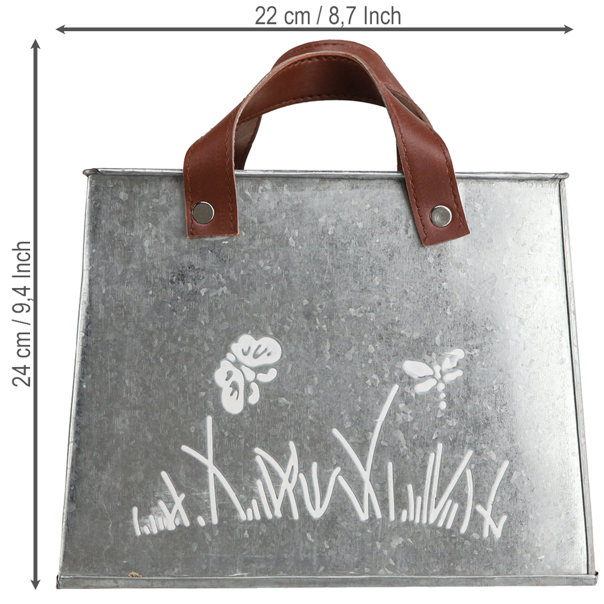Vores sølvfarvede dekorative metaltasker kombinerer funktionalitet og design på en ekstraordinær måde. Disse plantekasser er ideelle til dekoratører, kreative hjerner og alle, der ønsker at tilføje et strejf af elegance til deres hjem. Med et hvidt motiv af sommerfugle og græs på begge sider og de brune håndtag i kunstlæder får du et produkt, der både egner sig som plantekrukke og som dekorativt element til altanen eller bordet. Denne dekorative plantetaske fremhæver den rustikke charme og passer smukt sammen med andre vintage dekorationer. Giv dit hjem et personligt præg med disse ekstraordinære metalplantepotter, som imponerer med deres enkle, tidløse elegance.