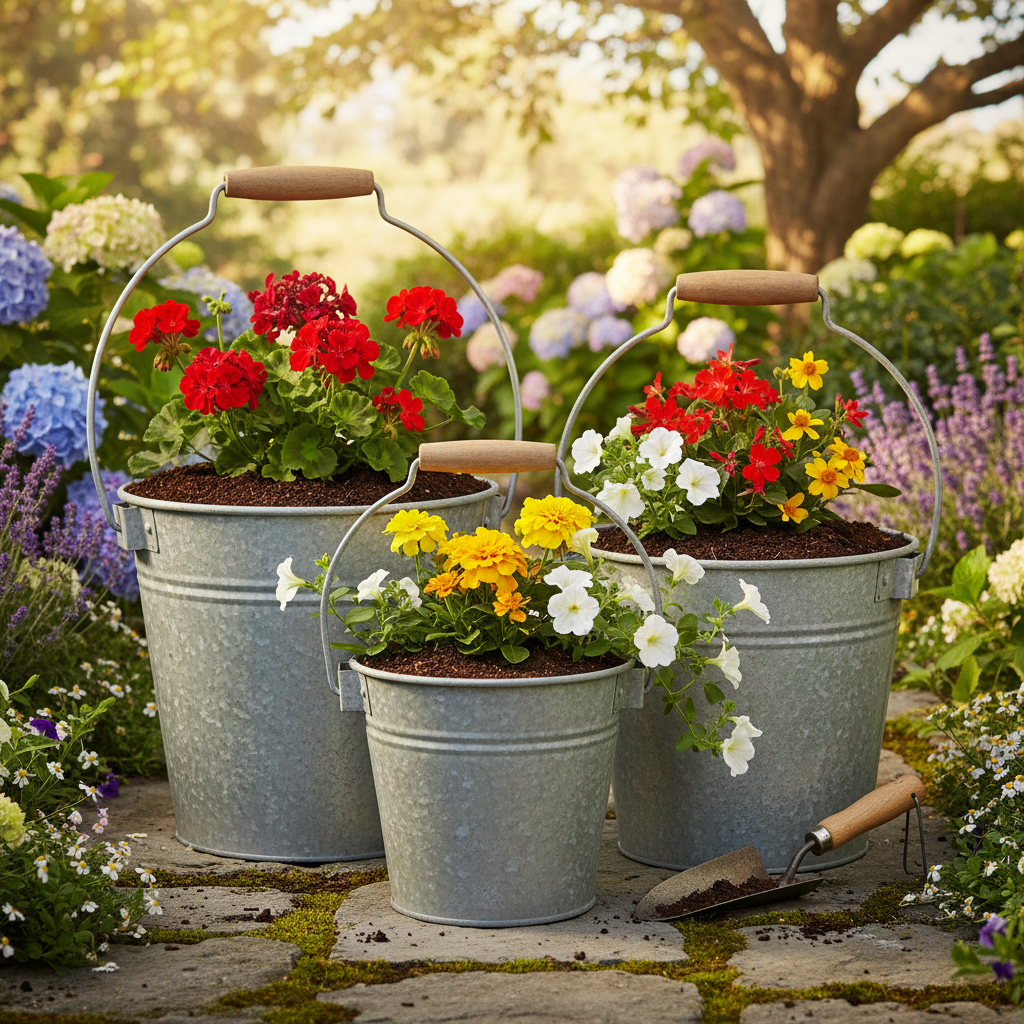 Oplev vores dekorative spande i vintagestil, som ikke kun ser godt ud som metalplantepotter. Sættet indeholder tre størrelser (Ø15/17,5/22cm), perfekt til hvert hjørne af dit hjem, altan eller have for at fremtrylle en nostalgisk flair.