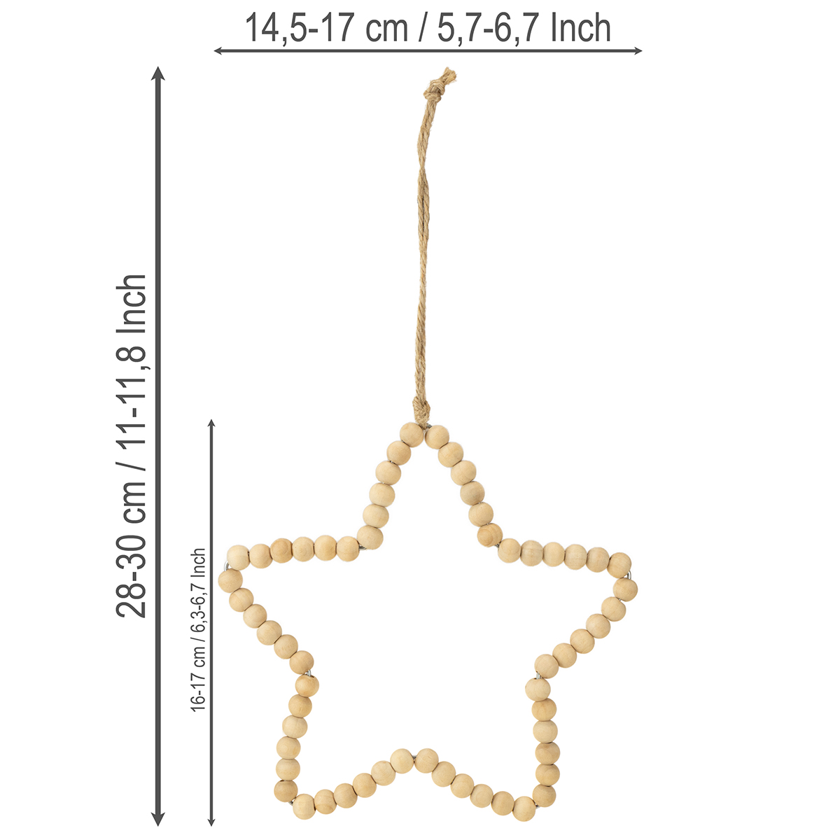 Perlerne er omkring en centimeter i diameter. Bøjlen består af en snor, også holdt naturlig. Pynten er fantastisk velegnet som juletræspynt, men også som hængende dekoration eller vinduesdekoration. Fordi julebøjlen ser lige godt ud fra alle sider takket være de runde træperler.