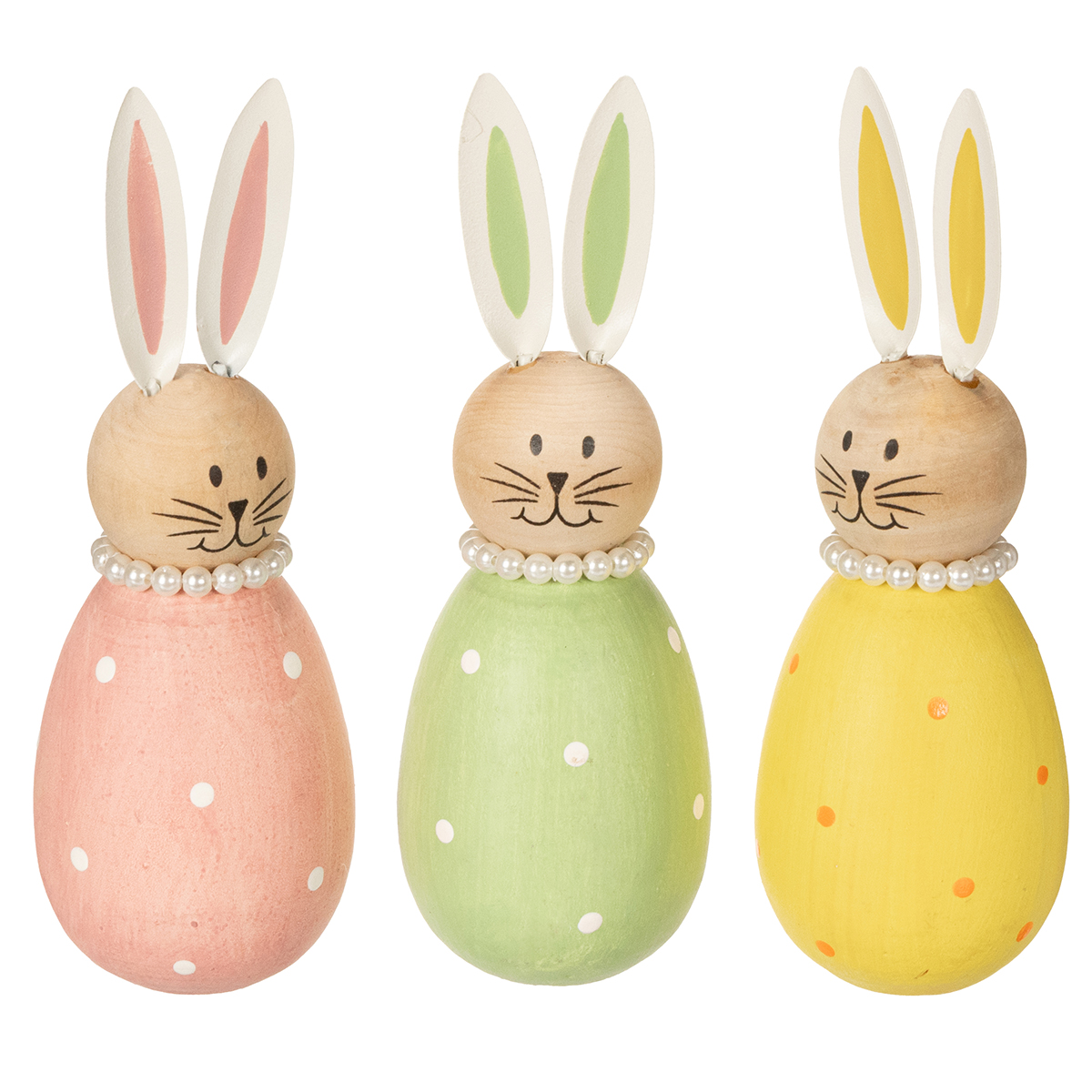 Dekorative kaninfigurer i pasteltræ, påskeharer med perlekæde, 14,5 x 5 cm, 3 stk.