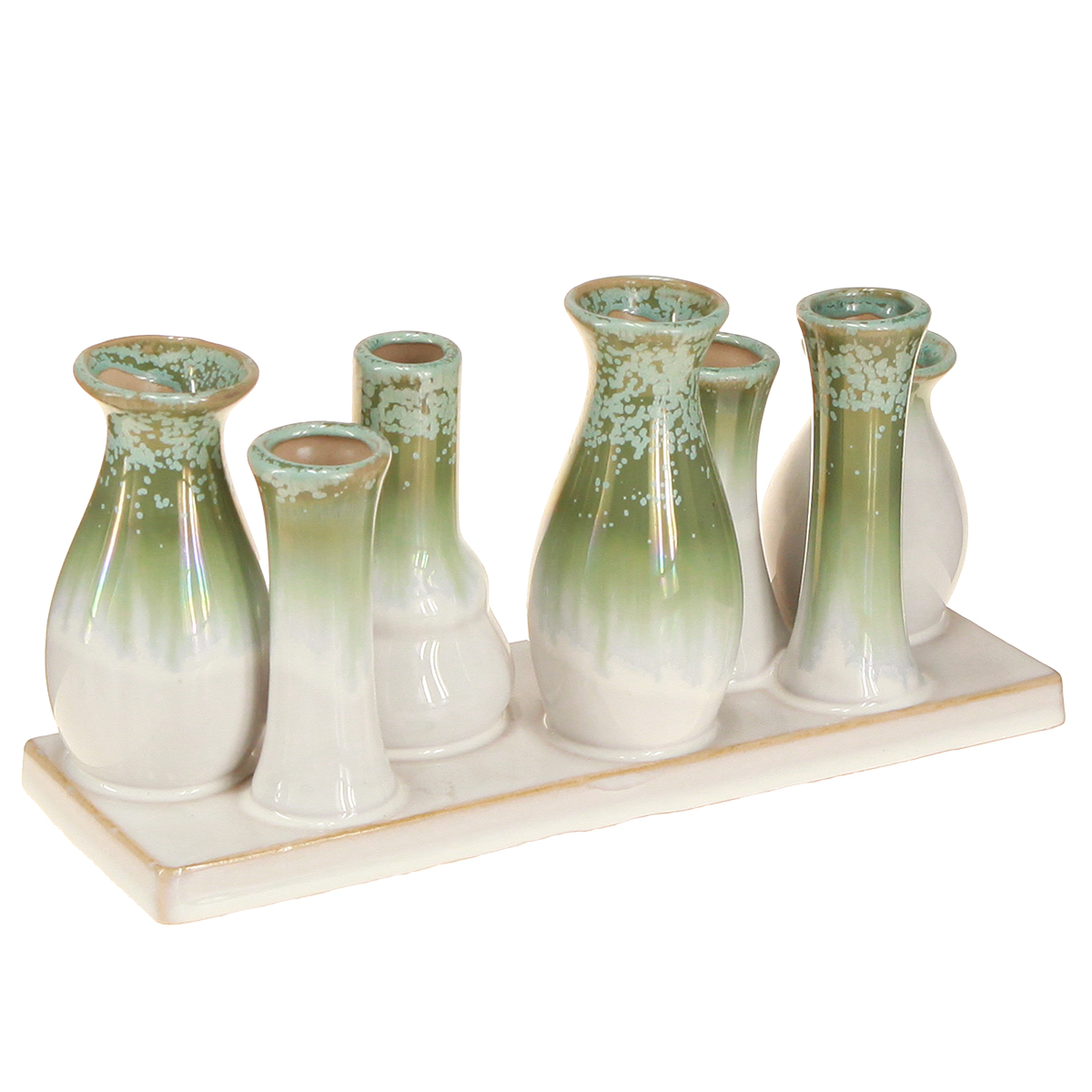 - Sæt med 7 dekorative keramikvaser på en robust bakke