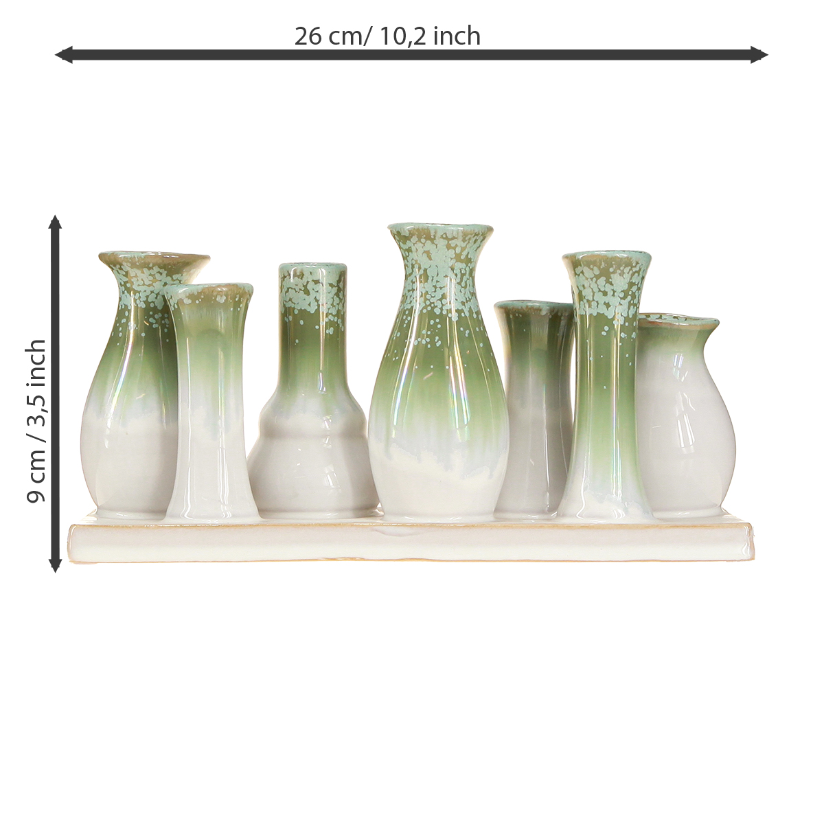 Hvornår har du sidst forbedret dit hjem med gennemtænkte detaljer, der tilføjer et særligt præg? Vores dekorative keramiske vasesæt på en bakke af høj kvalitet er det perfekte tilbehør til hjemmet! Disse smukke minivaser i bløde nuancer af grøn og hvid kombinerer elegance med tidløs enkelhed – perfekte til et harmonisk hjem. Med en længde på 26 cm og et rustikt look passer disse vaser perfekt ind i ethvert rum, uanset om det er spisebordet, vindueskarmen eller entréen.