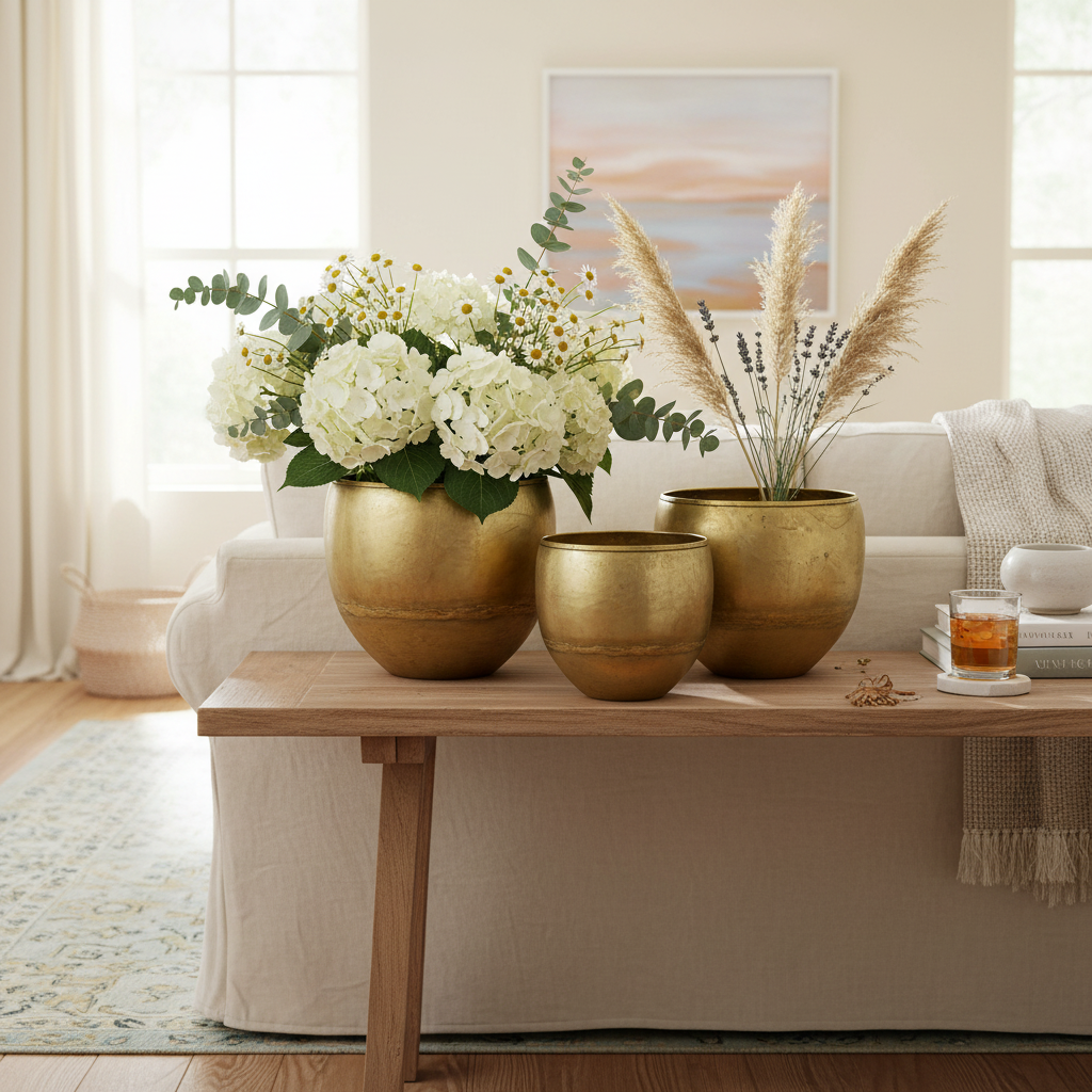 Dekorative vaser i messinglook i metal Ø18/15/12,5 cm, sæt med 3 stk.