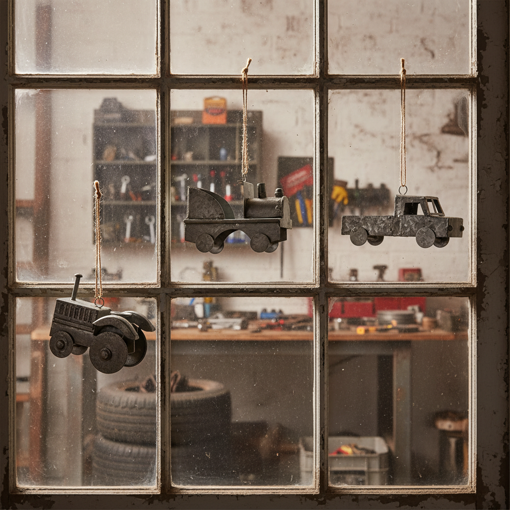 Dekorative vintage metalbiler til ophæng, assorterede størrelser, 9-10 cm, 4 stk.