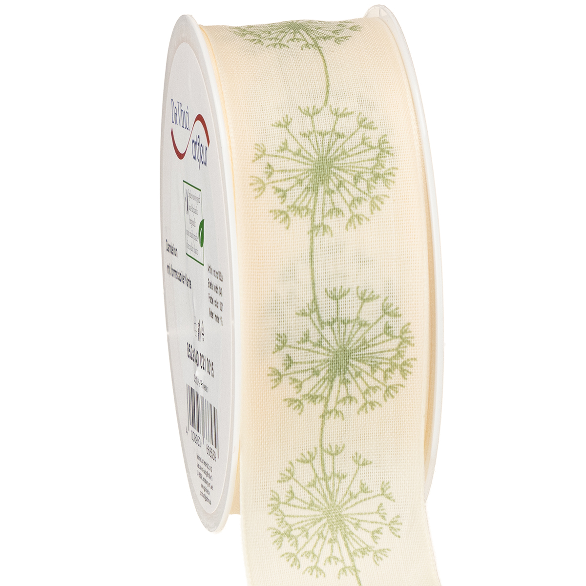 Dekorativt bånd, gavebånd, mælkebøttemotiv, cremefarvet, 40 mm, 15 m