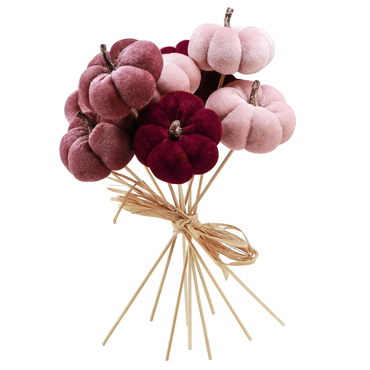 Dekorativt græskar lavet af stof græskar på pind bordeaux pink Ø7cm 9 stk