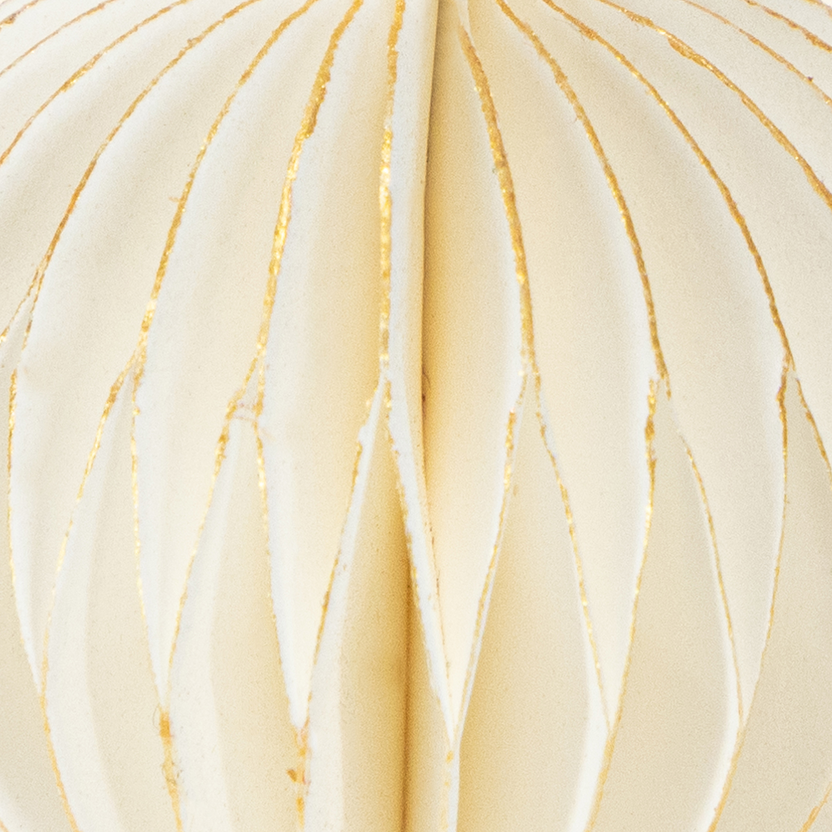 Den klare hvide farve, fremhævet af fine matguldkanter, skaber et harmonisk og tidløst helhedsindtryk. Uanset om det er på store juletræer eller som en charmerende dekoration på et juletræ på et bord – denne hængende julekugle af bikagepapir vil helt sikkert fange øjet og tilføje et strejf af stil.