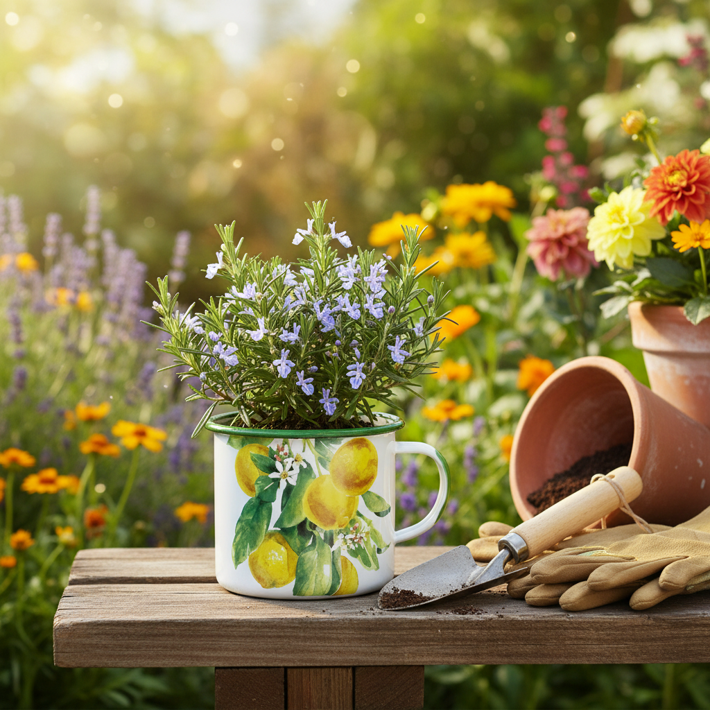 I denne emaljede plantekop kan du præsentere en lille blomst eller urteplanter på en meget elegant måde. Den dekorative kop med citrongren er fantastisk velegnet som middelhavs-cachepot!