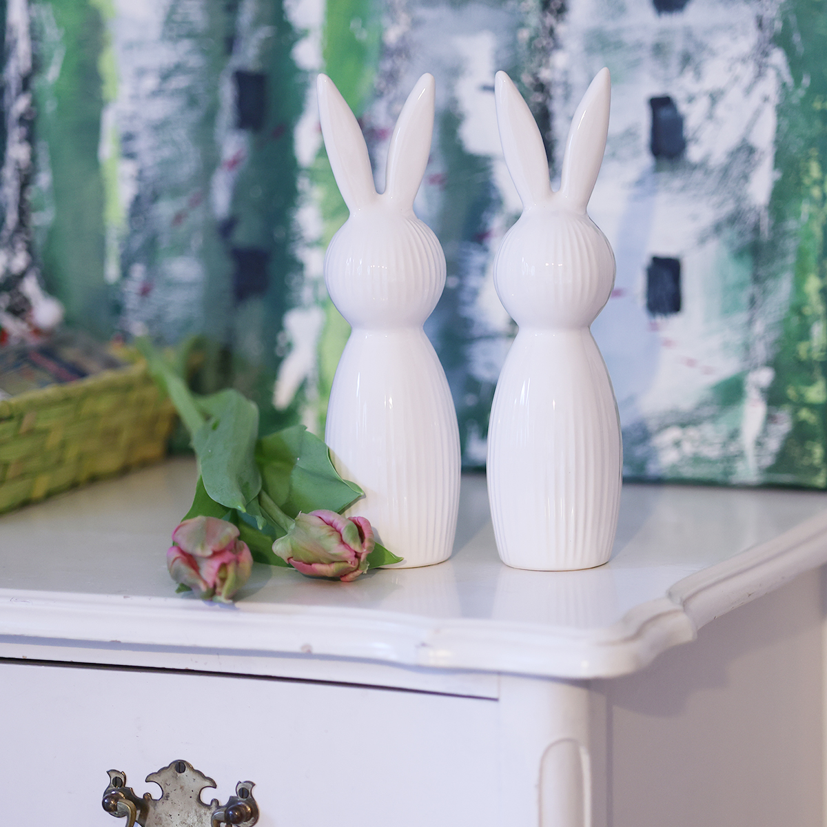 Forår i stuen, på skænken eller i vinduesrammen – intet problem med denne charmerende kaninfigur. Denne enkelt designede, 22 cm høje figur leveres i et sæt med to og tilbyder en perfekt blanding af moderne elegance og underspillet æstetik. Med sin blanke hvide overflade og diskrete rillede tekstur ser den sofistikeret, men diskret ud. Leder du efter forårsdekoration, der passer perfekt til moderne indretningsstile som skandinavisk minimalisme eller moderne design? Så tag et nærmere kig på denne keramiske kaninfigur. Den komplementerer din stil perfekt, især når den kombineres med friske grønne og hvide buketter eller sammen med forårsarrangementer af dekorative æg. Lyder det fristende? Bestil nu og gør dit hjem til et rigtigt blikfang i denne sæson!