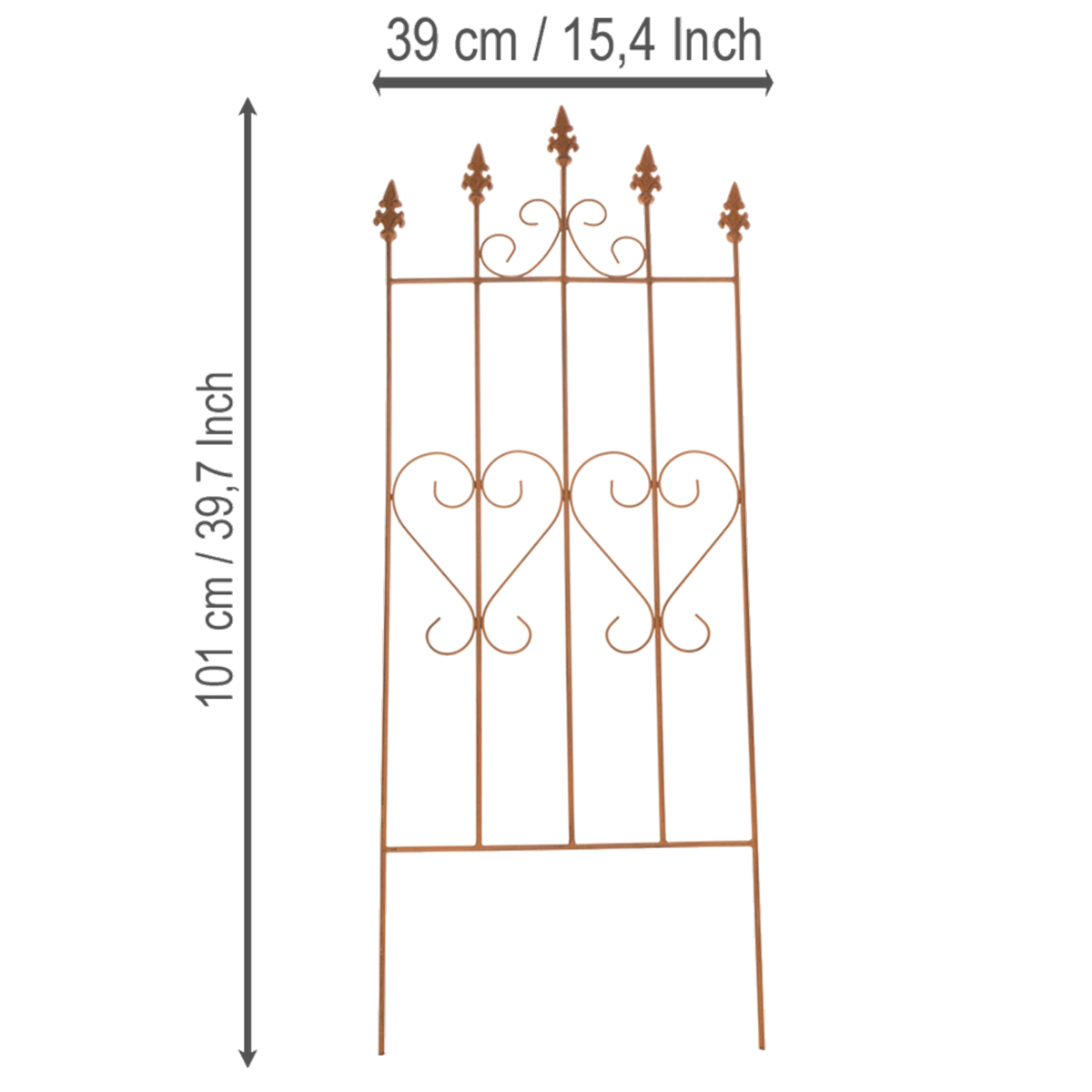 Lad din have blomstre! Dette espalier med sit nostalgiske hjertemotiv udstråler ikke kun et strejf af romantik, men er også yderst praktisk. Ideelt til roser eller som en charmerende visuel kant i haven, tilføjer dette espalier et særligt præg til ethvert udendørsområde. Med en højde på 101 centimeter, en bredde på 39 centimeter og en dybde på 1 centimeter er det både overskueligt og pladsbesparende. Det brune, forvitrede stållook harmonerer smukt med naturlige grønne toner og livlige blomsterfarver. Uanset om det er på terrassen, i forhaven eller som en dekorativ tilføjelse til blomsterbede, er dette espalier et uundværligt tilbehør til hjemmet for enhver naturelsker.