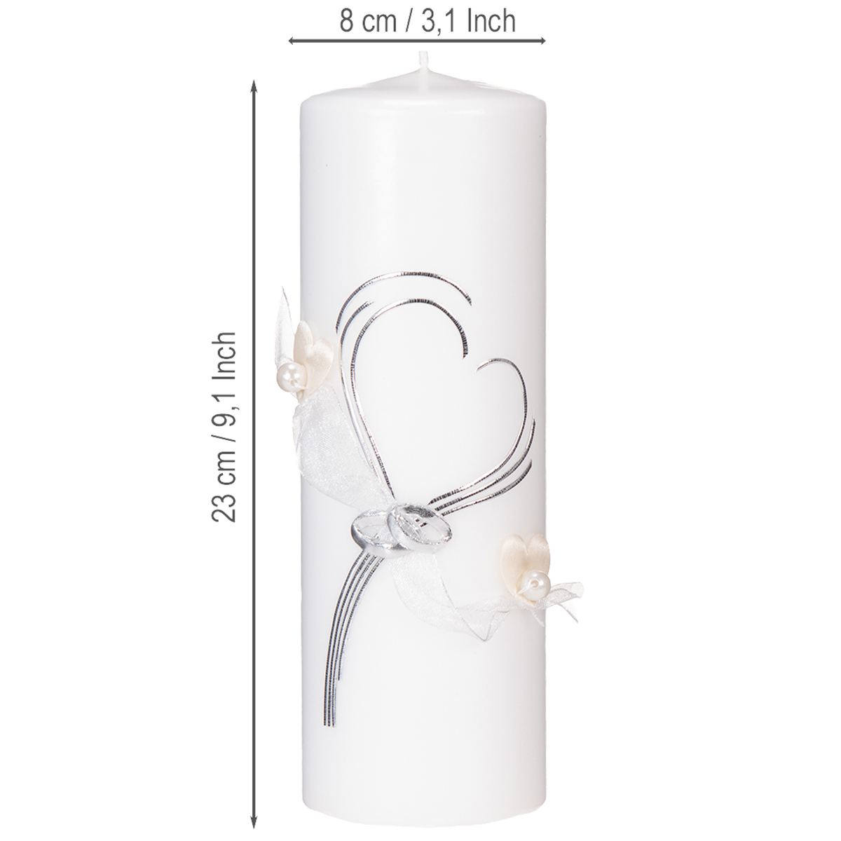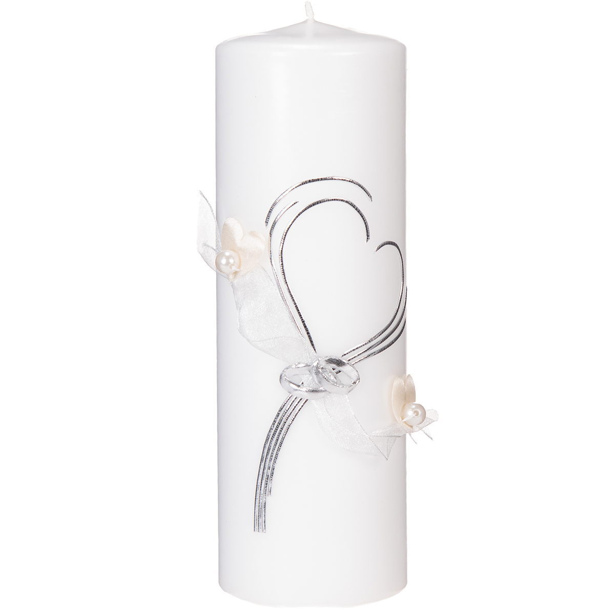 Festligt bryllupslys med et stilfuldt hjertedesign, sølvudsmykninger og organzabånd – ideelt til bryllupper og sølvbryllupsdage, 230/80 mm