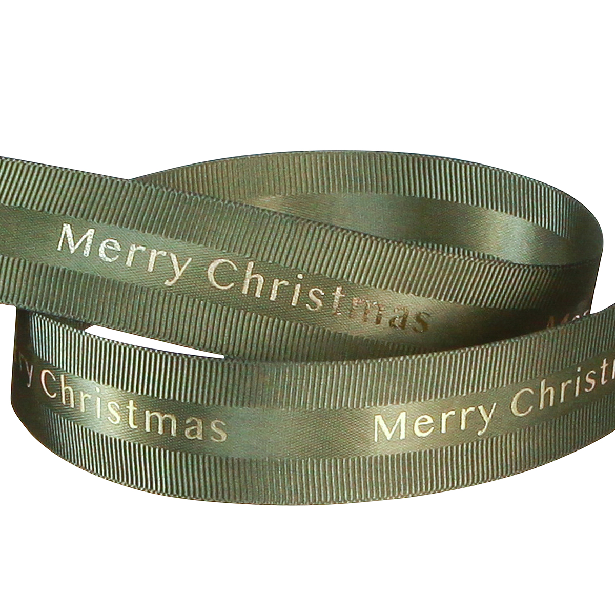 Festligt julebånd i mørkegrøn med gyldne 'Merry Christmas' bogstaver, bredde 25mm, længde 20m