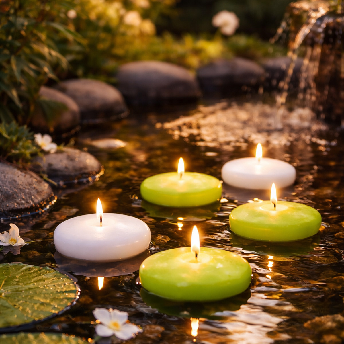 Takket være de flydende lys, der driver blidt omkring blandt åkander, siv og andre vandplanter, forvandles den lille havedam til en magisk oase af ro. Alternativt kan du placere lysene i et stort zinkkar eller en blikspand fyldt med vand – et lille alternativ til en dam, der er en smuk dekoration til altaner og terrasser. Du kan endda bruge disse usædvanlige fyrfadslys som bordpynt. Fyld blot en lav skål, en glasvase eller en større lanterne med vand, og lad de flydende lys drive oven på den. Et fantastisk alternativ til den klassiske lysestage, som du yderligere kan personliggøre med blomsterblade, sten og farverigt dekorativt sand.