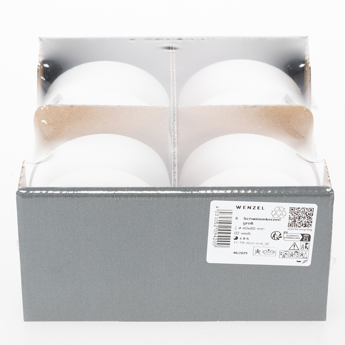 De hvide voksflydende lys leveres i et sæt med 8. Hvert lys er cirka 8 centimeter i diameter og 4 centimeter højt, med en brændetid på cirka 8 timer.
