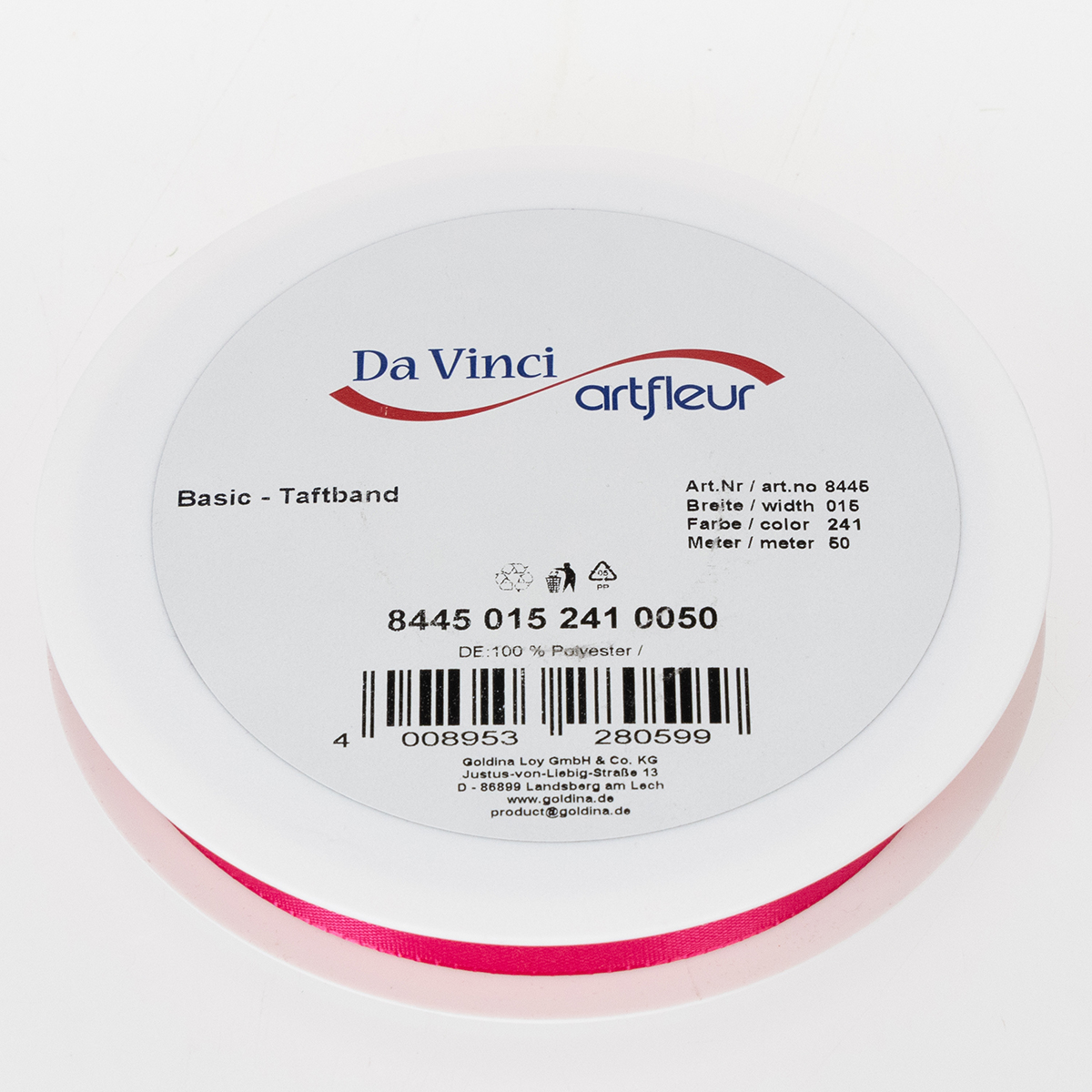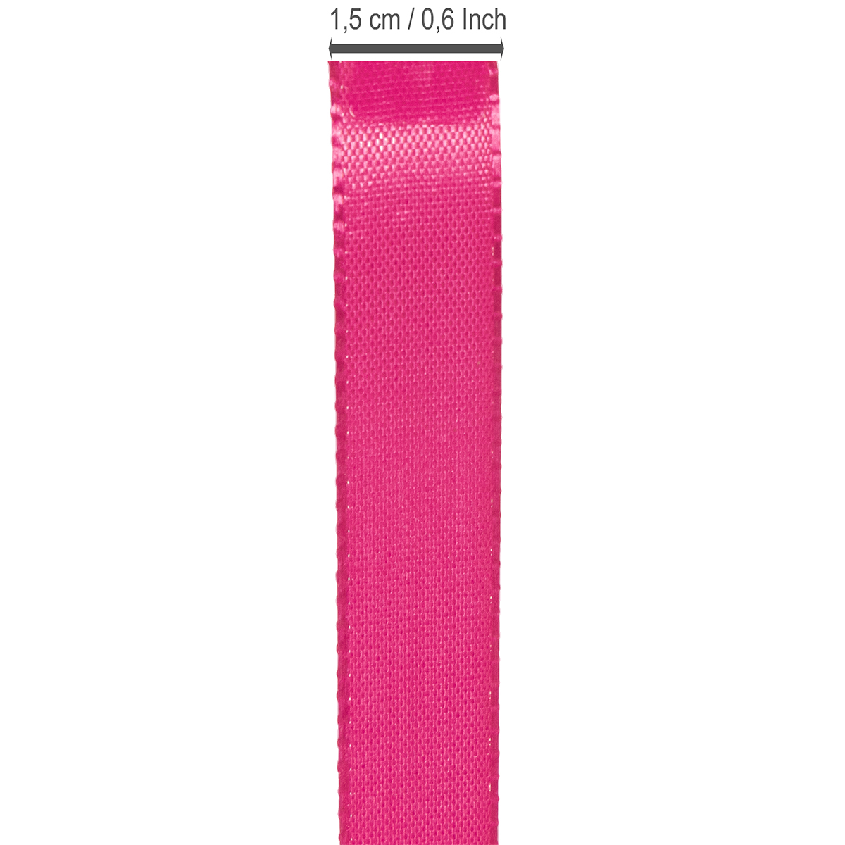 Det lyserøde gave- og dekorationbånd måler cirka 15 millimeter i bredden og cirka 50 meter i længden. Det er lavet af 100% polyamid og leveres til dig på en plastspole.