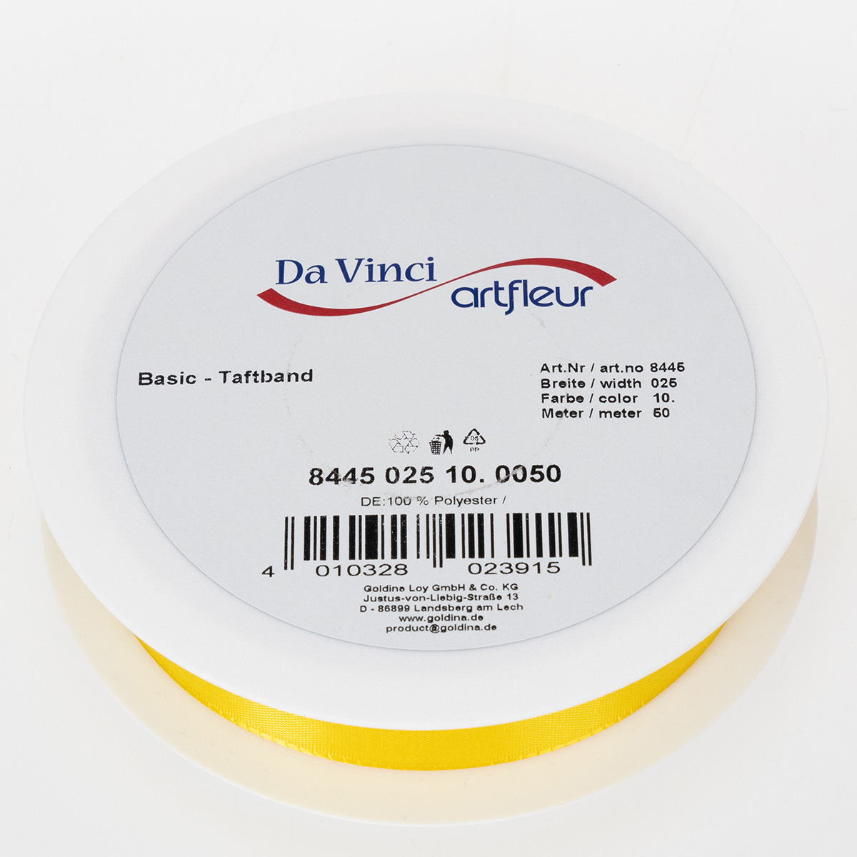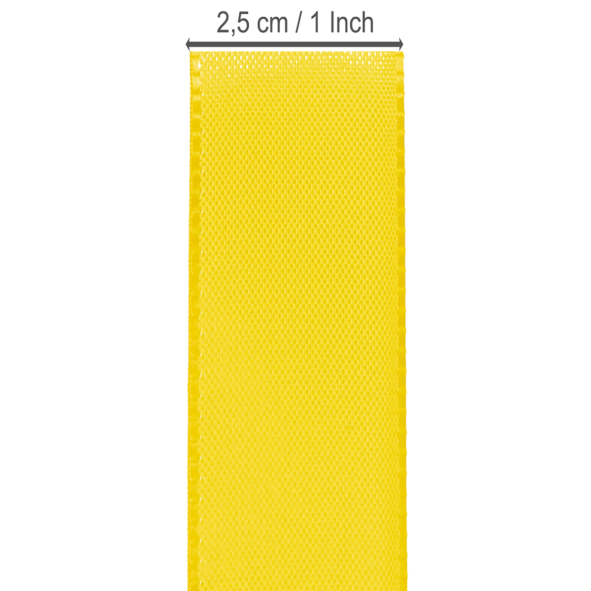 Gave- og dekorationbåndet i gult har en bredde på ca. 25 millimeter og en længde på ca. 50 meter.