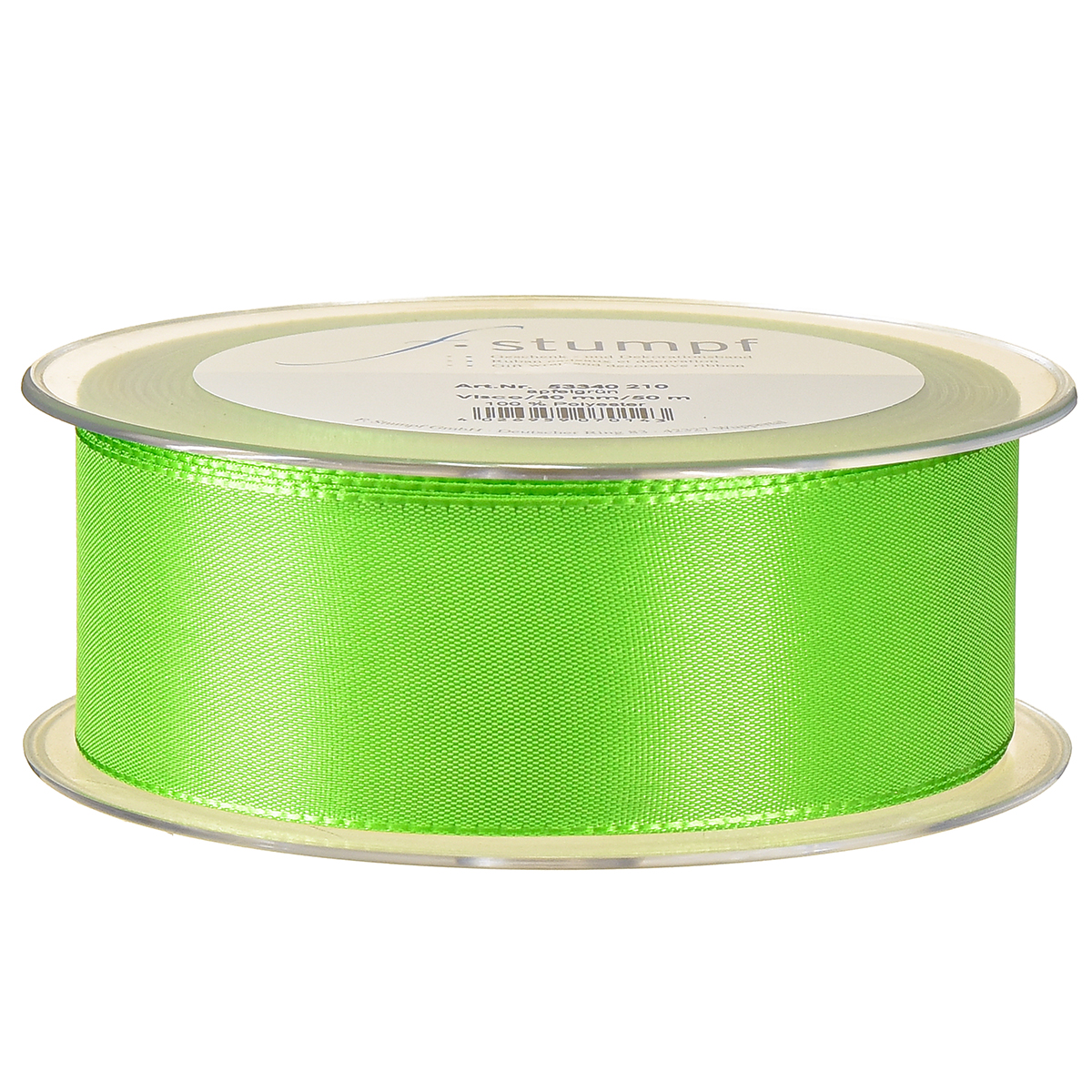 Gave- eller dekorationsbåndet i lysegrønt er cirka 40 millimeter bredt og cirka 50 meter langt. Den var lavet af 100% polyester.