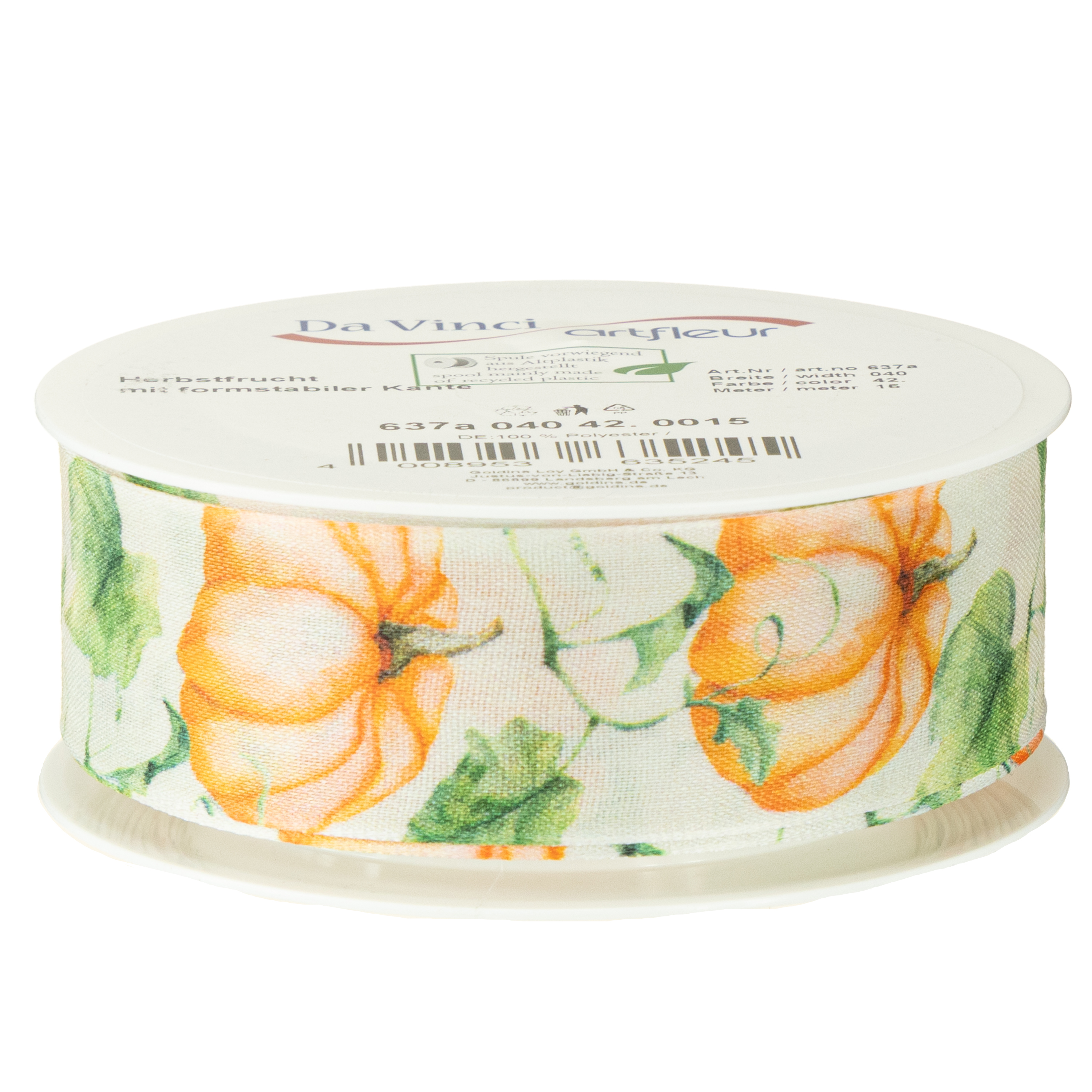 Båndet er printet med et detaljeret græskarmotiv. Blade og ranker er arrangeret malerisk omkring den orange efterårsfrugt. Dekorationsbåndet viser sig også at være et kvalitetsprodukt takket være den formstabile selvkant.