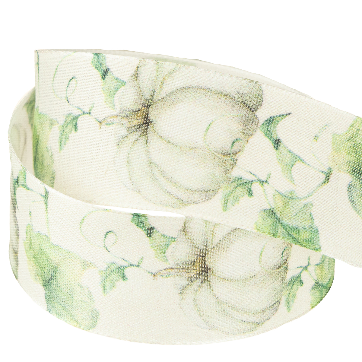 De smukkeste græskarmotiver er trykt på det hvide bånd i efterårsagtig, rustik stil. Græskarplantens karakterfulde blade og ranker var også tænkt på, når det kom til gavebåndet. Den formstabile kant gør det meget nemmere at designe og dekorere med båndet om efteråret.