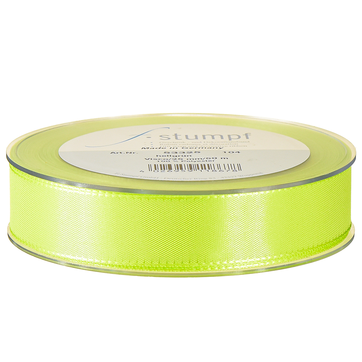 Gavebåndet og pyntebåndet i lysegrønt er omkring 25 millimeter bredt og omkring 50 meter langt.