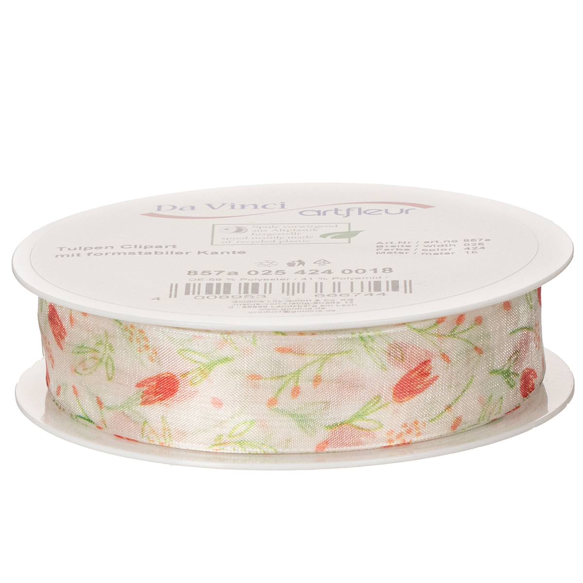 Dette gavebånd imponerer med sit romantiske tulipanmønster og fremragende materialekvalitet. Med en længde på 18 meter og en bredde på 2,5 cm har du masser af bånd til at udfolde din kreativitet. Uanset om det bruges til gaveindpakning, som en dekorativ sløjfe på vaser eller som borddekoration, harmonerer tulipanmotivet smukt med de subtile farvevariationer og den højkvalitets polyestertekstur. Det skaber et særligt harmonisk og tiltalende look, når det kombineres med forårsblomster som påskeliljer eller tulipaner.