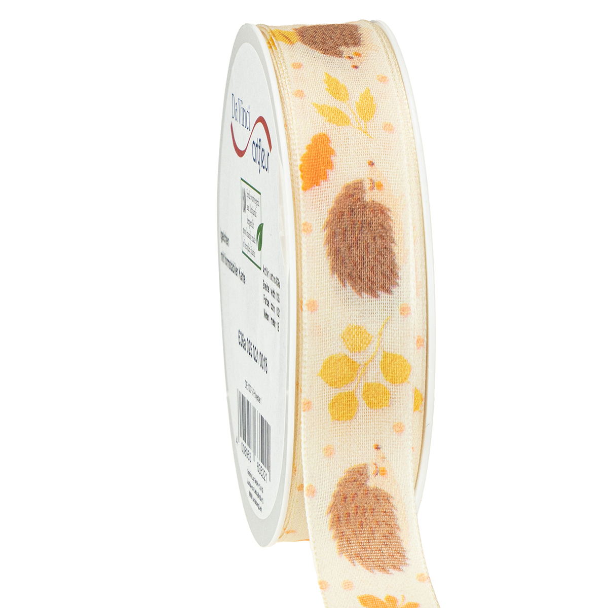 Det søde gavebånd med pindsvinet er lavet af 100% polyester og rulles op på en plastikspole. Den er omkring 15 millimeter bred og omkring 18 meter lang.