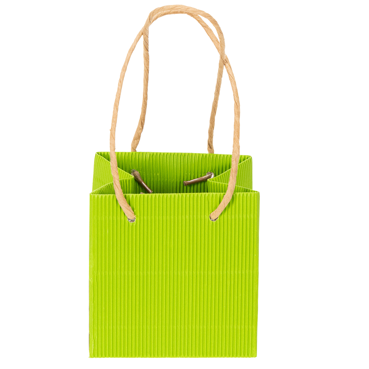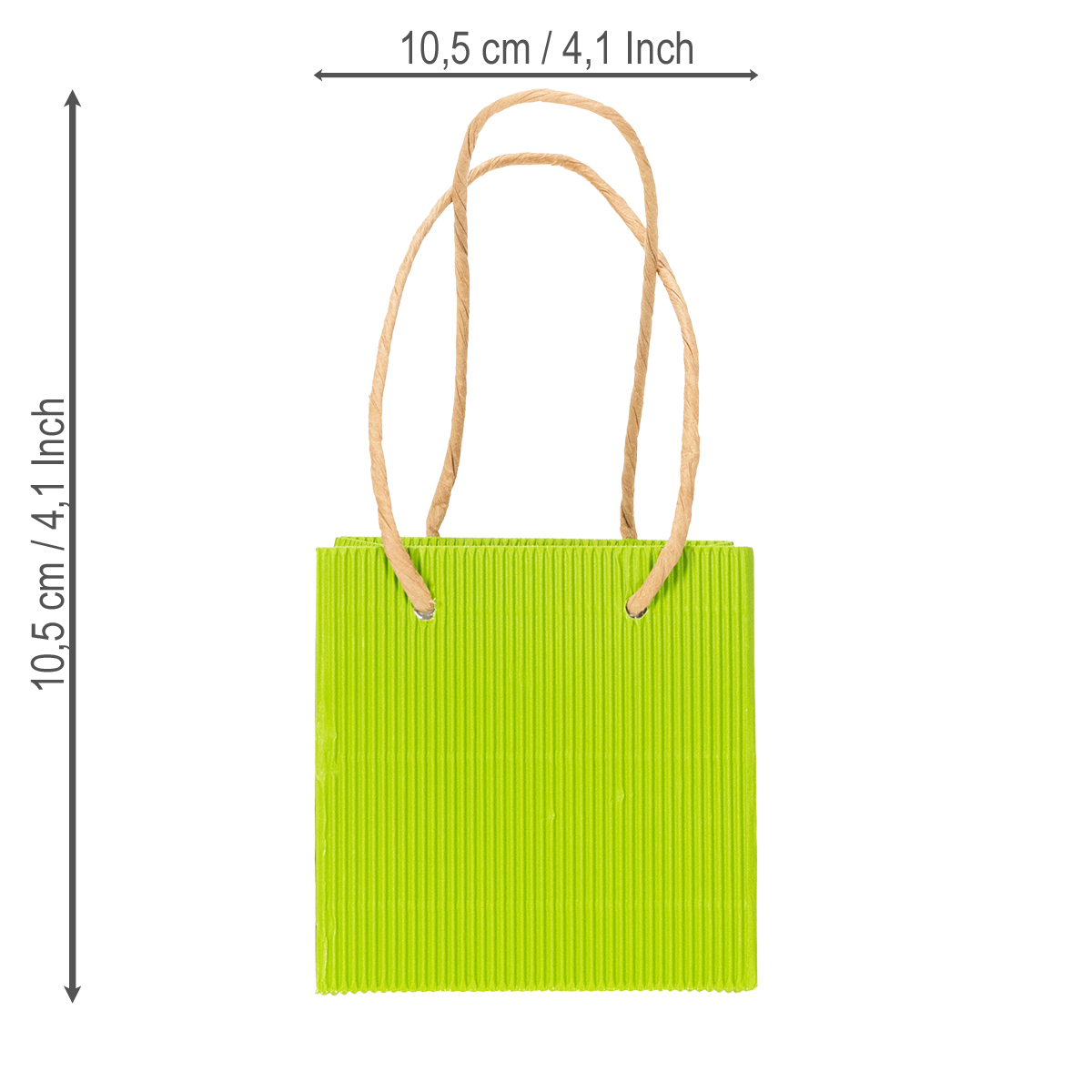 Papirposen er en del af et sæt på 8, med 2 poser hver farvet i orange, grøn, gul eller lyserød. Dimensionerne på hver taske er ca. 10,5 x 10,5 x 10,5 centimeter. Gaveposen er også så stabil, fordi dens overflade er bølgepap og derfor kan modstå mere vægt. Derudover er bunden forstærket med en ekstra pap. Tasken er også meget smart, hvis du udfylder hjemmelavede cookies eller andre lækkerier og derefter tager dem meget elegant til et møde med venner.