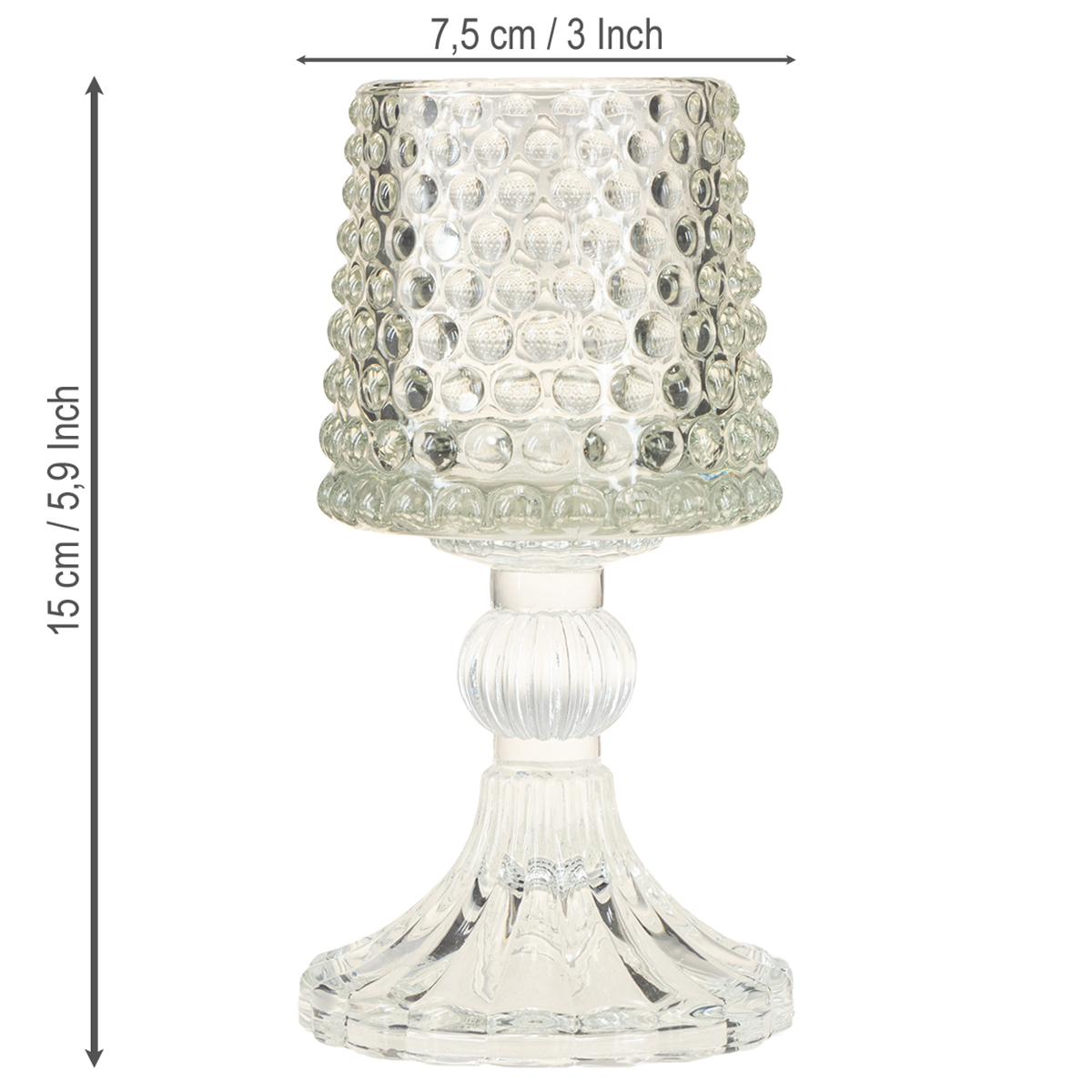 Glasfyrfadsstagerne med en base og en højde på cirka 15 cm er sande allroundere. Deres delikate udseende komplementeres af den elegante kombination af prikker og riller. Hver glasfyrfadsstage fremstår som et lille kunstværk, men har også praktiske fordele. Glassets klare finish lader stearinlyset skinne jævnt og skaber en harmonisk lysatmosfære – perfekt til en romantisk middag eller hyggelige timer på sofaen.