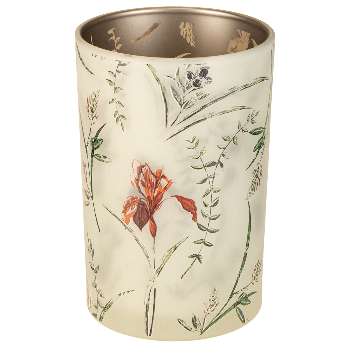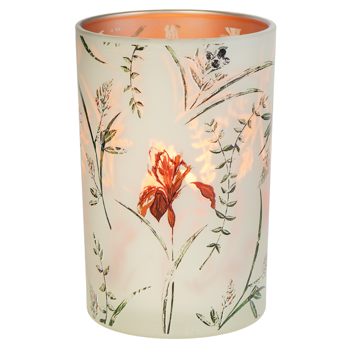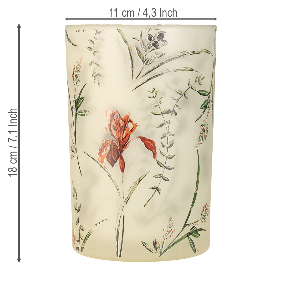 Glasfyrfadsstagen med sit blomsterdesign er mere end bare en lysestage – den er et statement-tilbehør til dit hjem. Det fine blomstermønster i beige, grøn og rød giver den et naturligt og harmonisk look, der smukt komplementerer vintage- eller landlig indretning. Det håndlavede design sikrer, at hver lysestage er unik. Med en højde på 18 cm og en diameter på 12 cm tilbyder den rigelig plads til både almindelige fyrfadslys og dekorative lys. Glasset af høj kvalitet lader lys og varme skinne smukt igennem – en effekt, der ser særligt magisk ud i svagt lys.