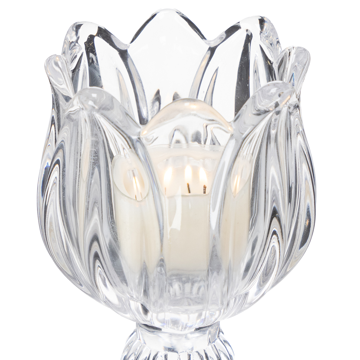 Disse glaslysestager med blomstermønster imponerer ikke kun med deres visuelle appel, men også med deres alsidighed. De er lavet af transparent glas af høj kvalitet og reflekterer smukt stearinlysets lys og skaber et fængslende samspil mellem lys og skygge. Uanset om du bruger dem til en romantisk middag for to, som iøjnefaldende dekorationer til en elegant middagsselskab eller som stilfulde detaljer ved en bryllupsreception – de passer altid perfekt.