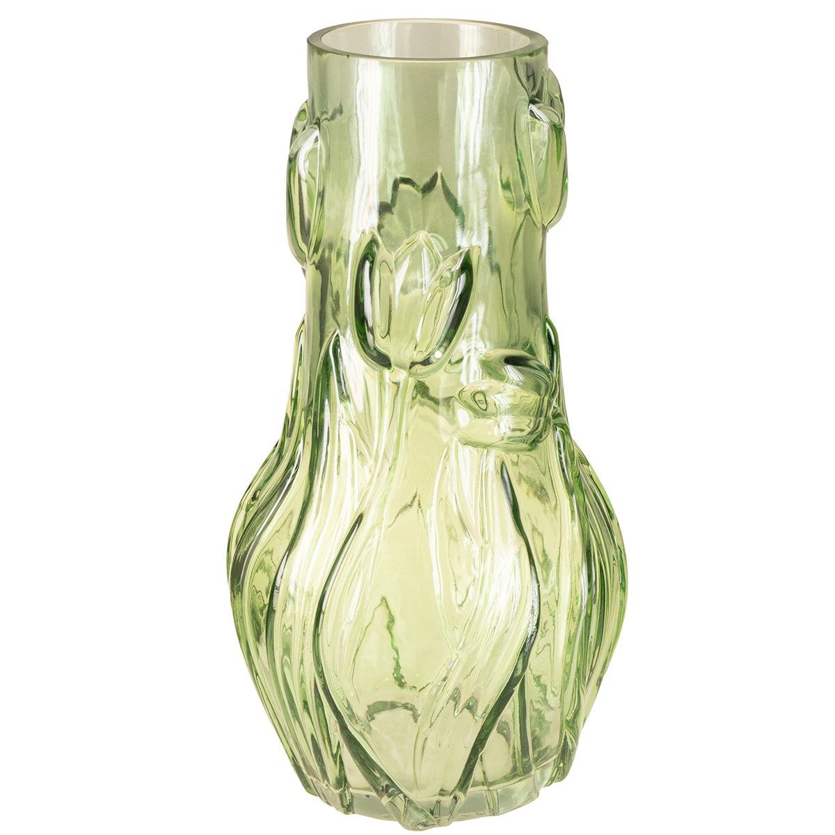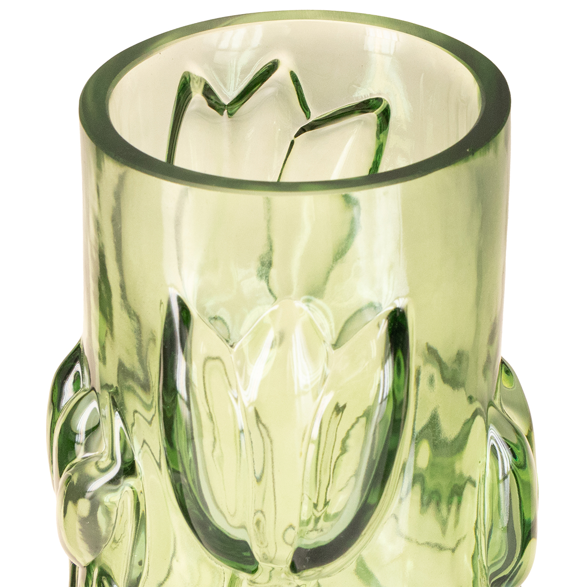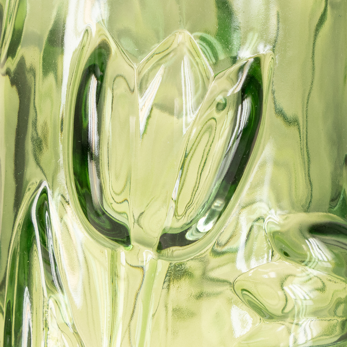 Denne 30 cm høje glasvase med sin klare grønne nuance betager med sin tidløst elegante karakter. Dens unikke tulipanmønster bringer et strejf af naturen direkte ind i dit hjem. Kombinationen af skinnende glas og den bløde grønne tone tilføjer subtile farveaccenter uden at være overvældende. Med en diameter på 16 cm tilbyder vasen rigelig plads til frodige blomsterarrangementer uden at virke rodet.