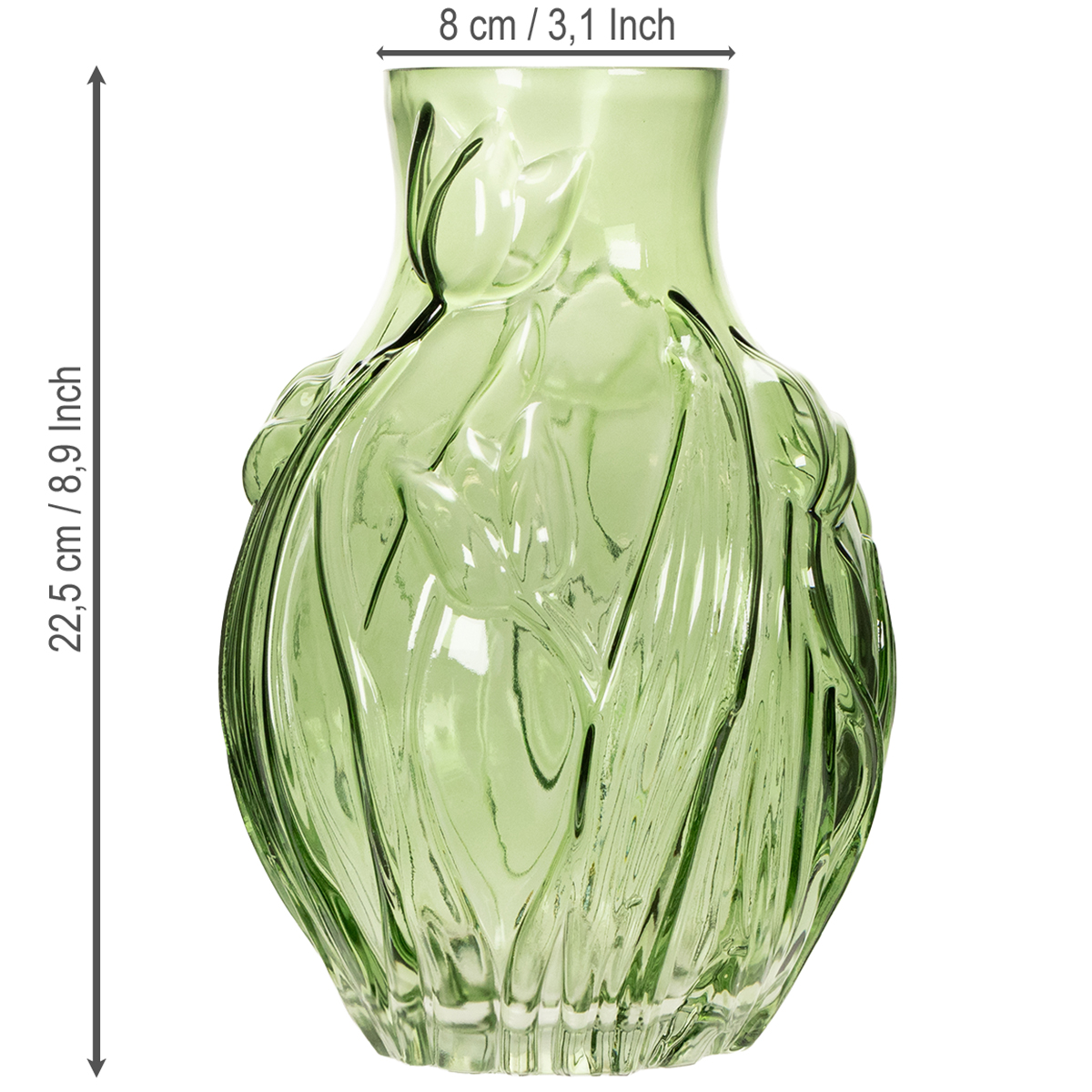 Har du nogensinde set en vase så charmerende og stilfuld, at du bare må eje den? Vores grønne tulipanvase i glas med sit prægede tulipandesign kunne være lige præcis den perle til dit hjem. Med sin attraktive grønne farve og perfekt gennemtænkte form kombinerer den tidløst design med funktionalitet. Uanset om du placerer den på et skænk, et spisebord eller i dit soveværelse, er denne vase garanteret et sandt blikfang!