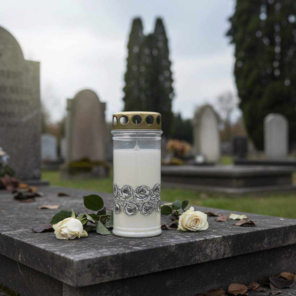 Dette hvide gravlys viser sig som en kombination af sølv og guld. Rosen blomstrer på kanten skinner sølv, mens låget er guldfarvet.