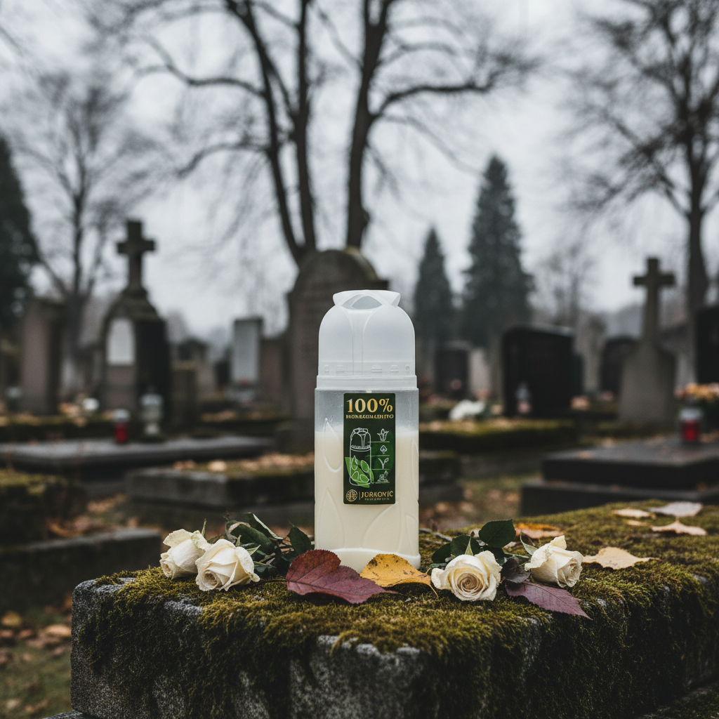 Det specielle ved dette gravlys er dets gennemsigtige låg lavet af 100 procent komposterbart plastik, hvilket gør lyset til en miljøvenlig følgesvend til enhver grav. ICP-seglet bekræfter, at stearinlyset er industrielt komposterbart og derfor opfylder dit ønske om et bæredygtigt liv, selv som souvenir.